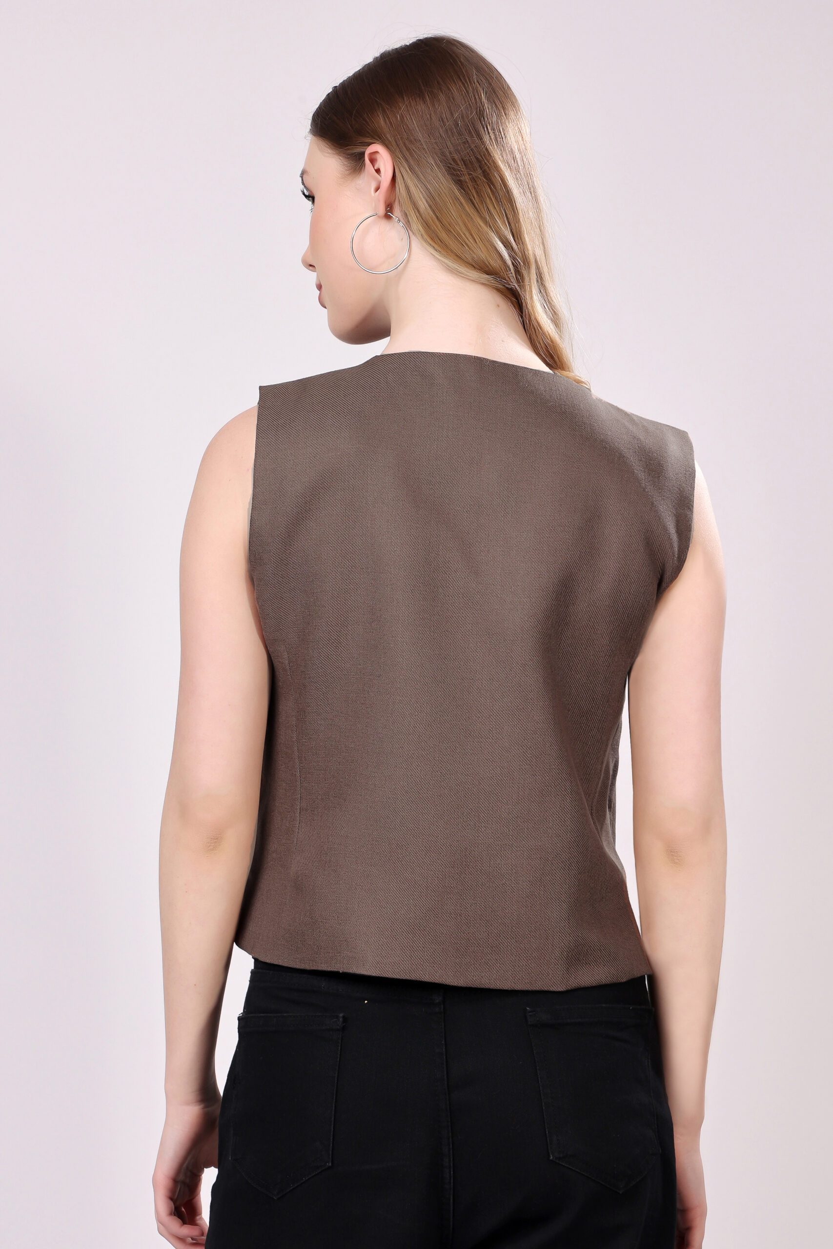- Design: Tailored fit for a refined and polished silhouette Front button closure for easy wear and a stylish finish Sleeveless design for versatile layering Two Functional pockets