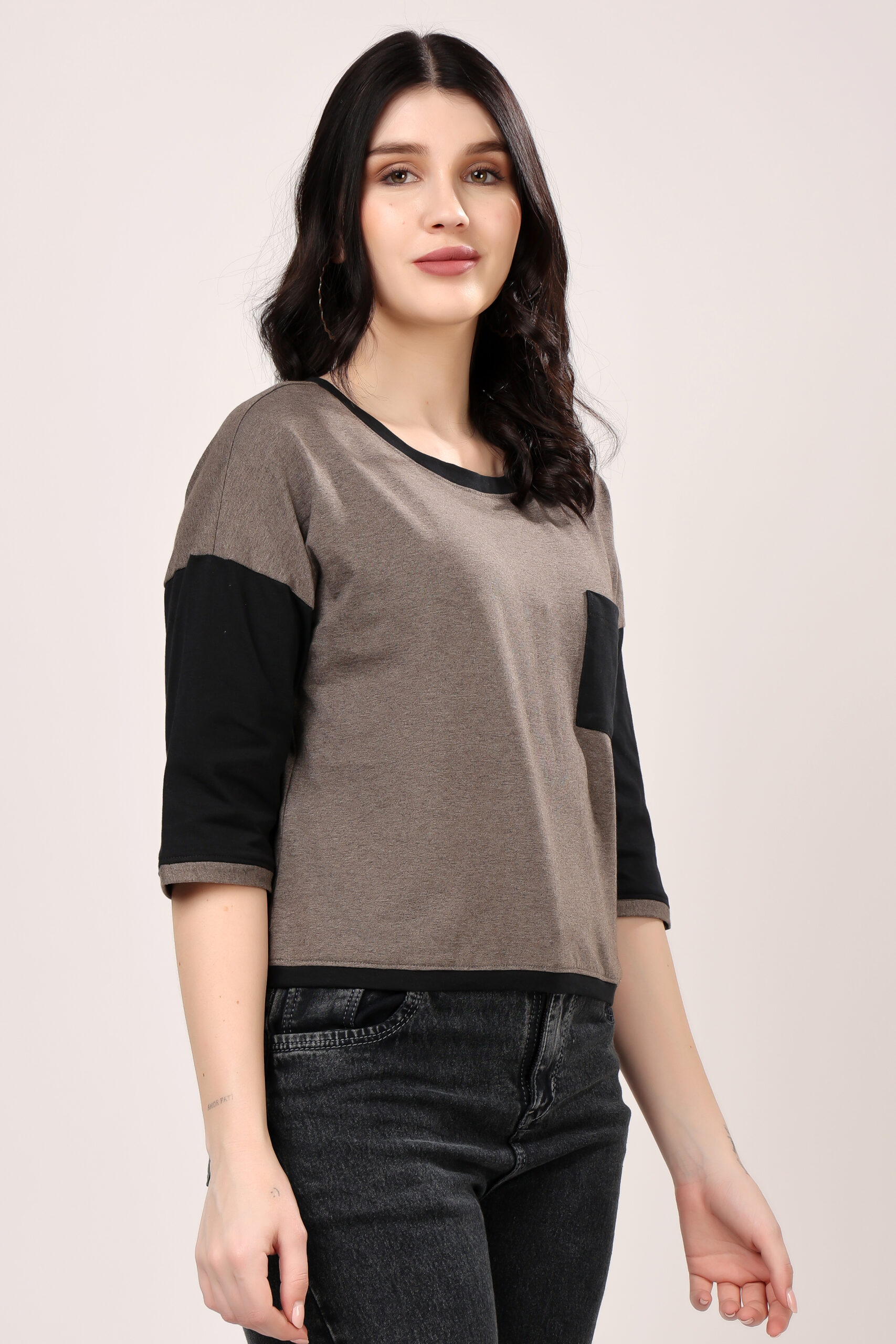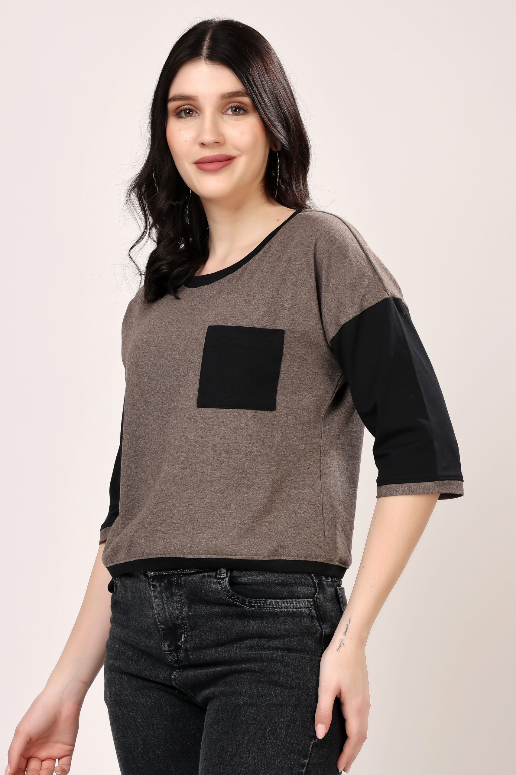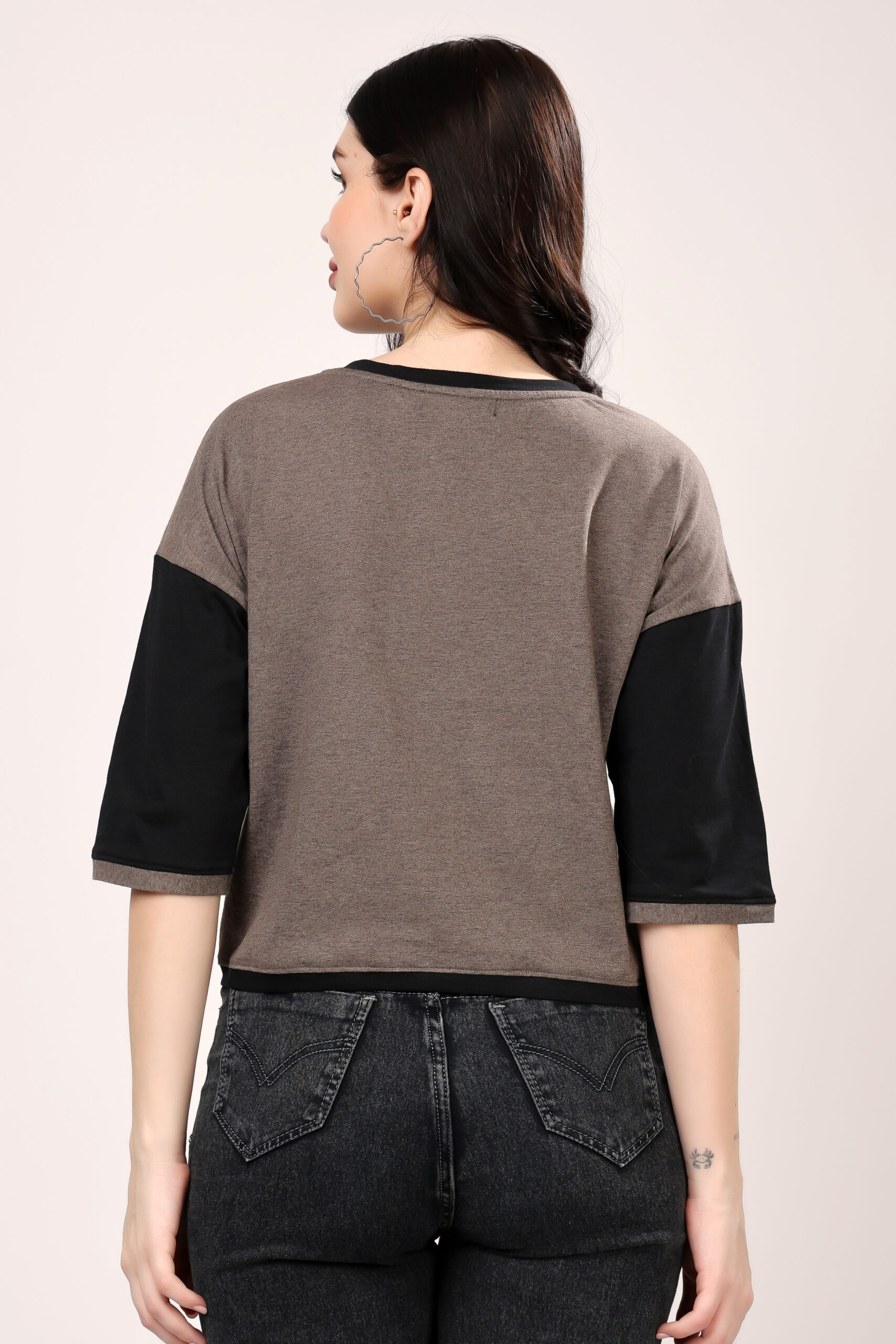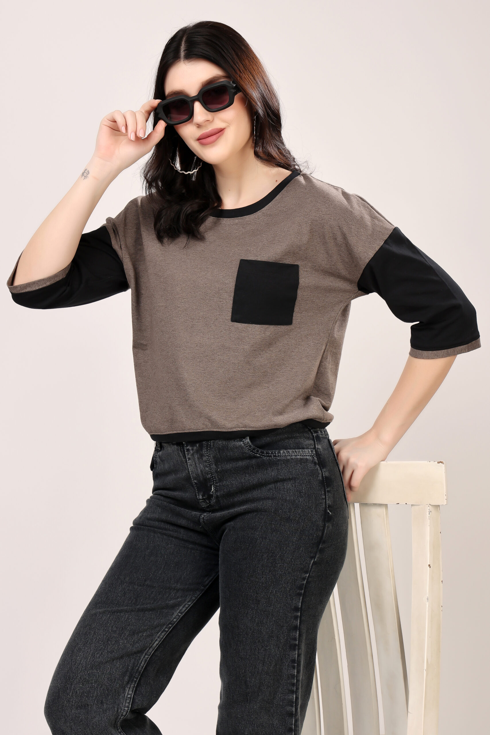 Casual Contrast Panel Jersey T-Shirt for Women Grey and Black
