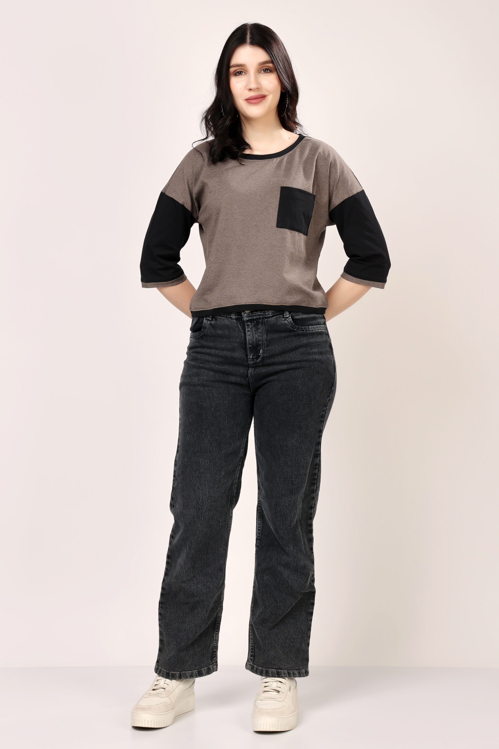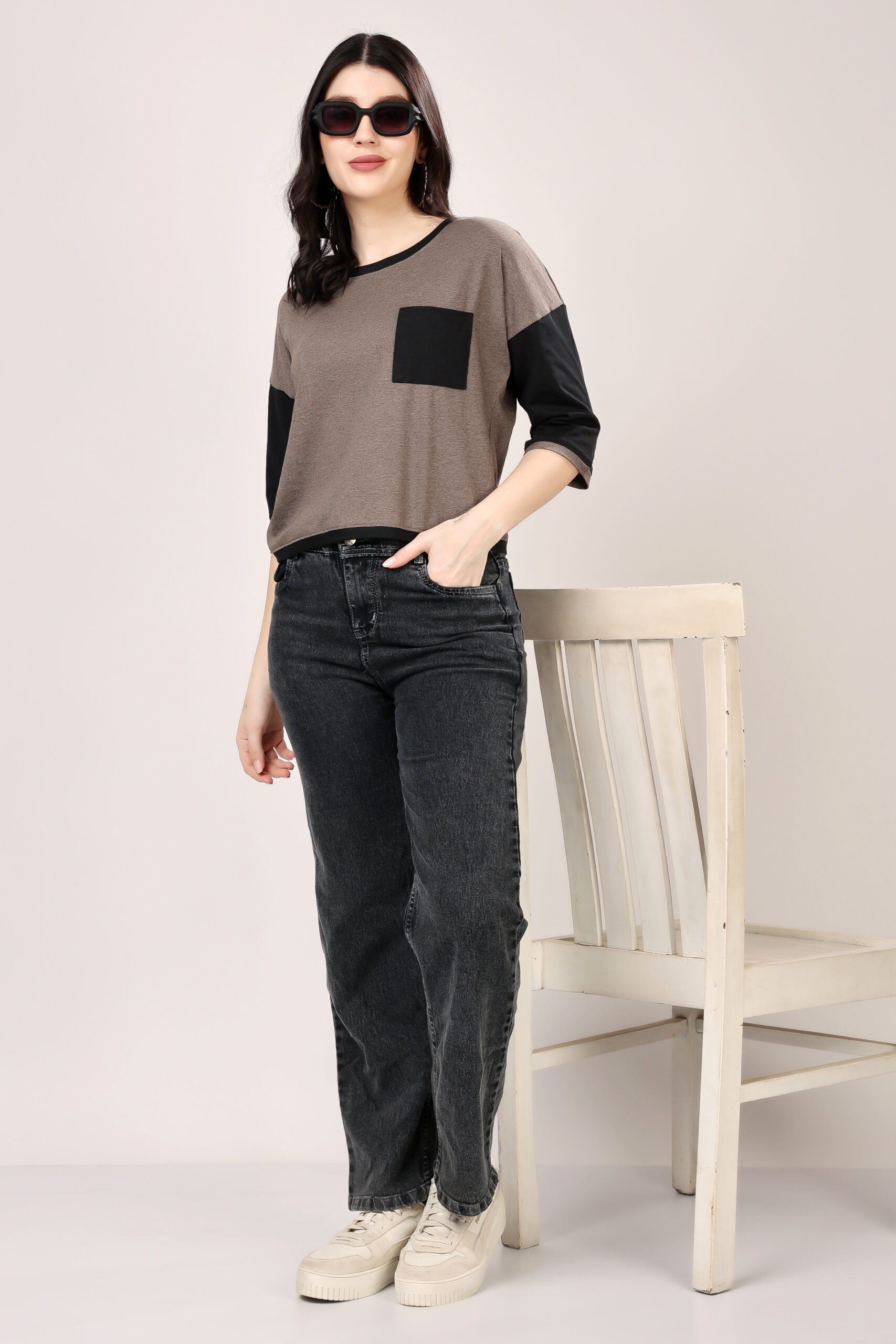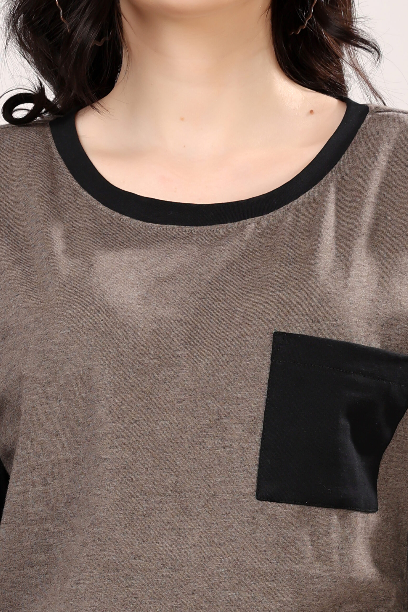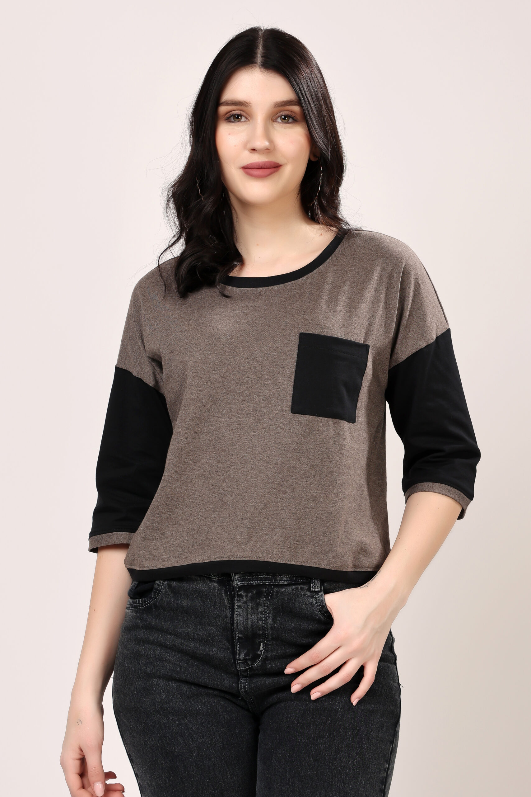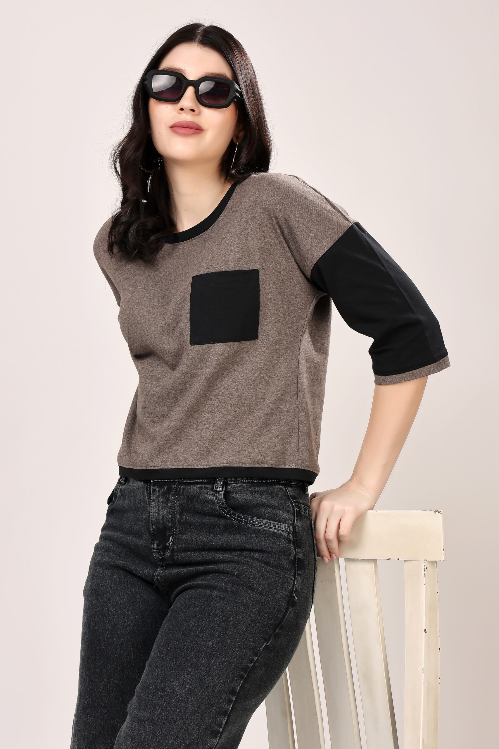 Casual Contrast Panel Jersey T-Shirt for Women Grey and Black
