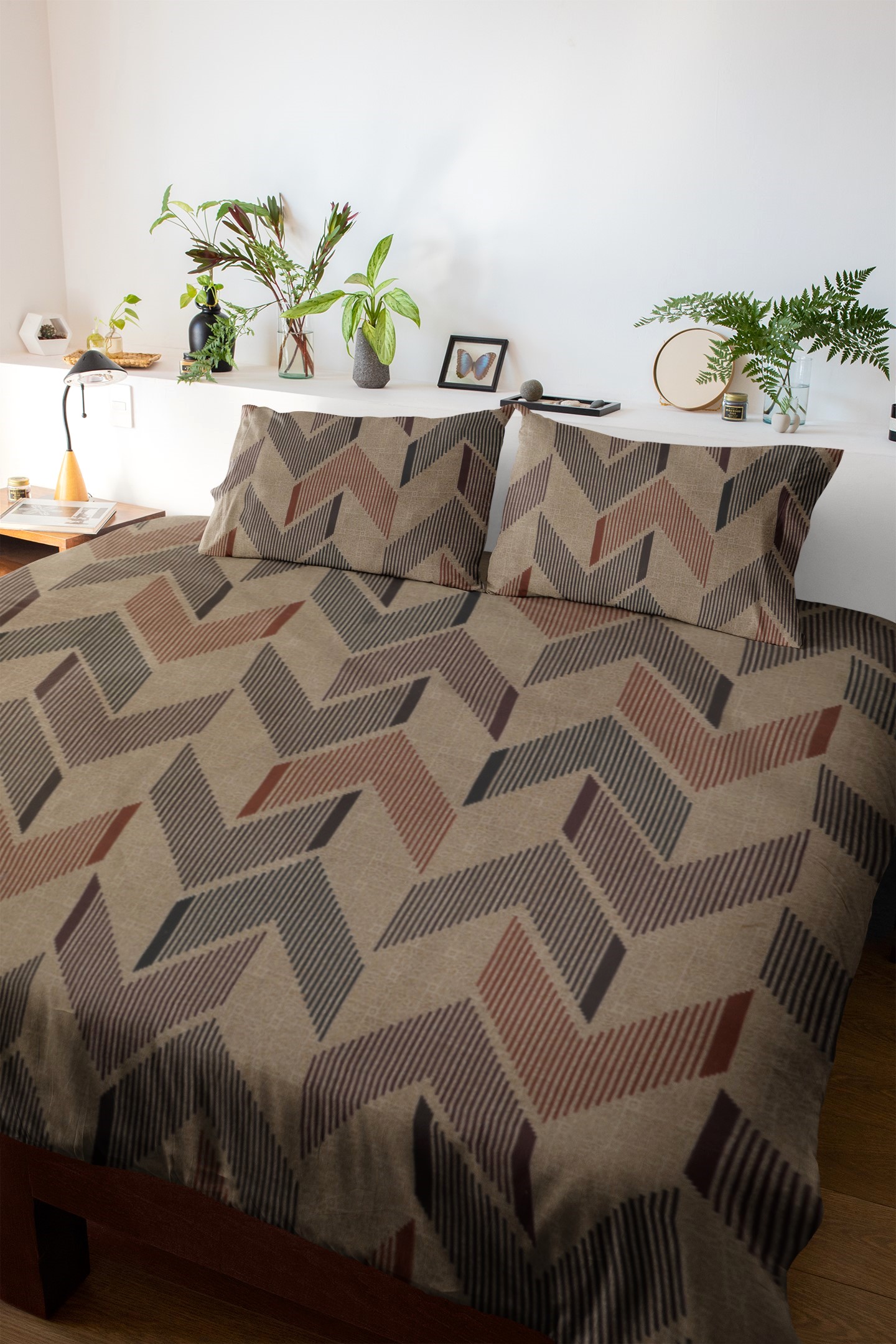 Add a modern touch to your bedroom with this bold geometric bedsheet set. The chevron pattern in earthy tones of rust, brown, and black on a neutral beige base,pairs well with neutral or solid decor, making it perfect for contemporary spaces.