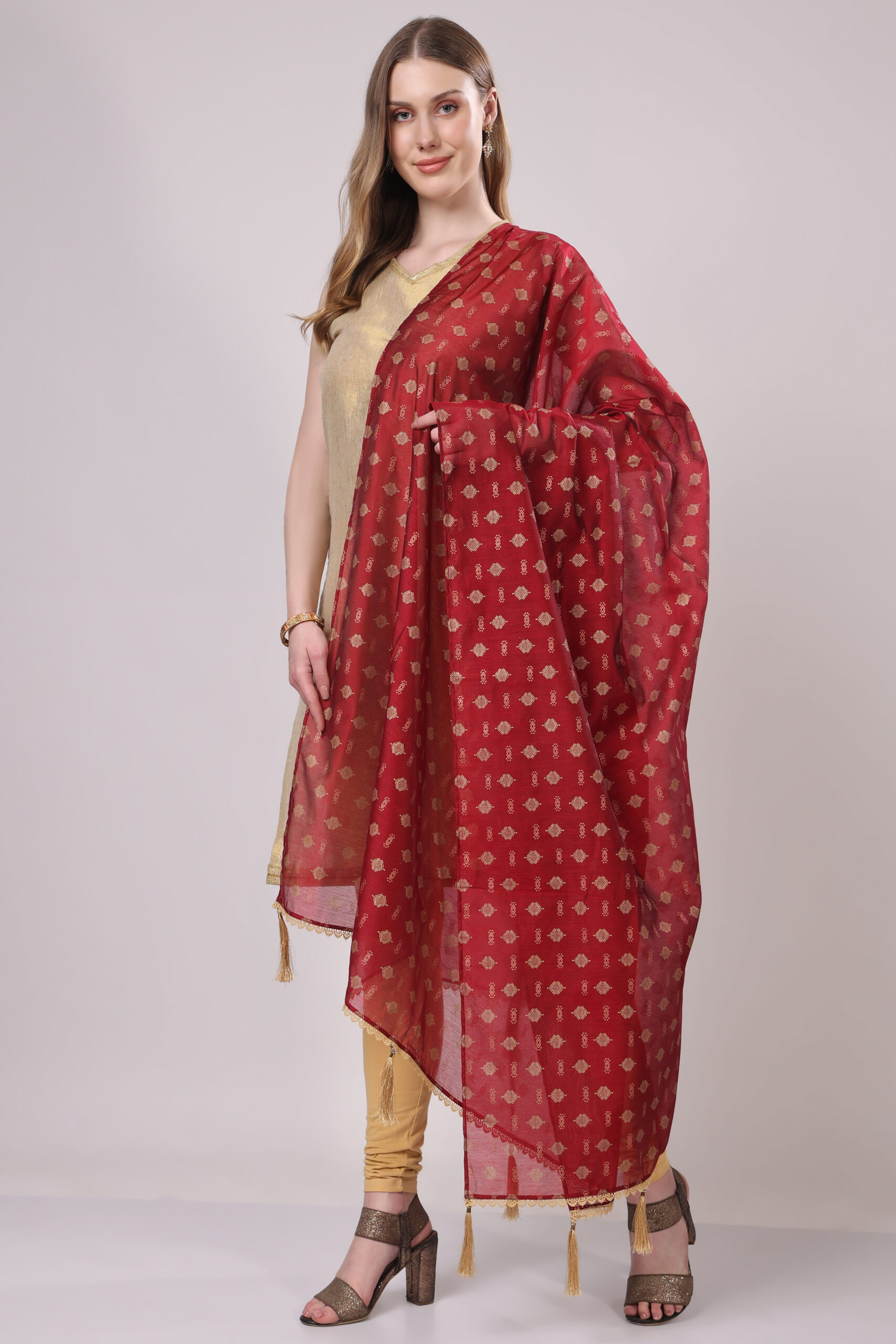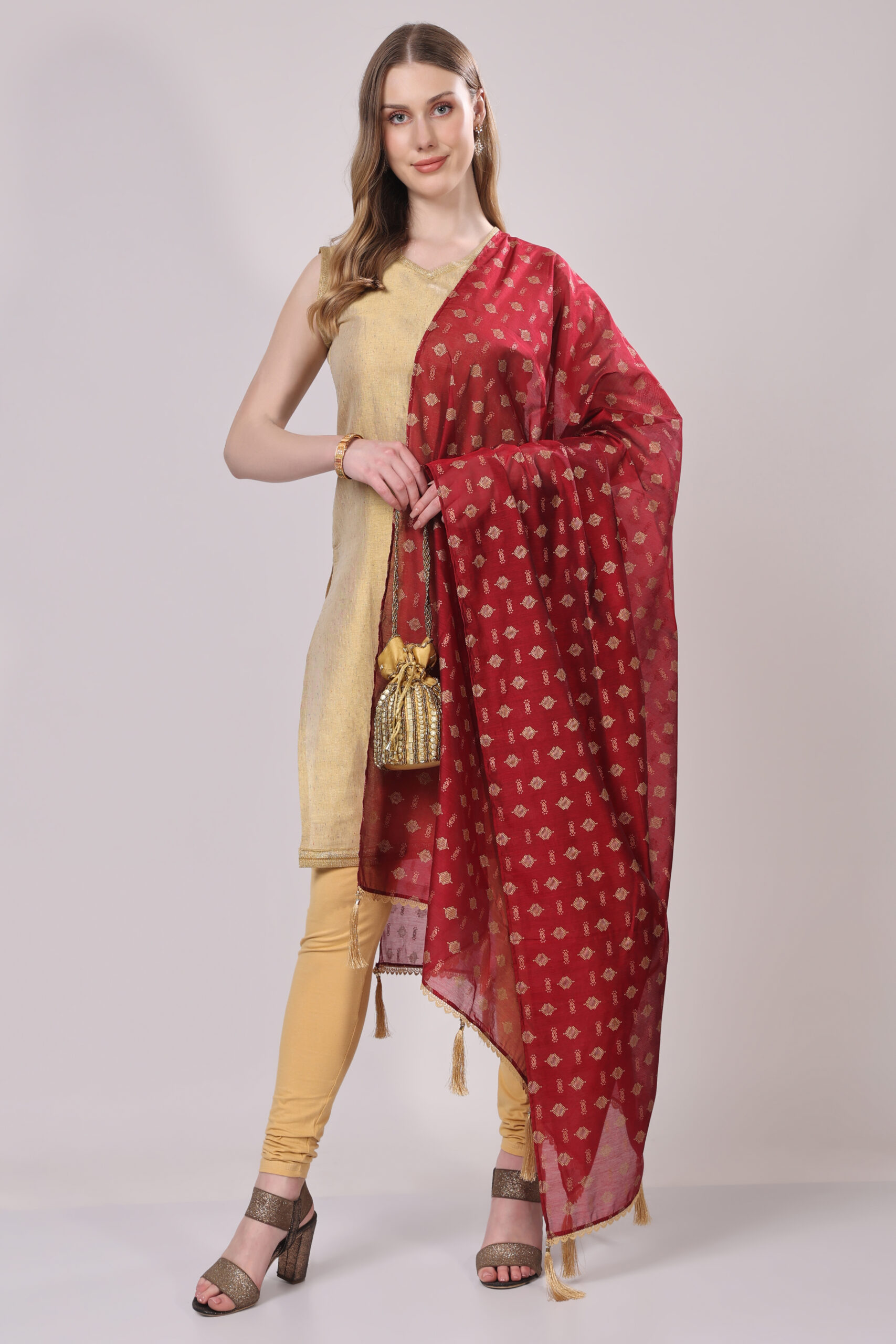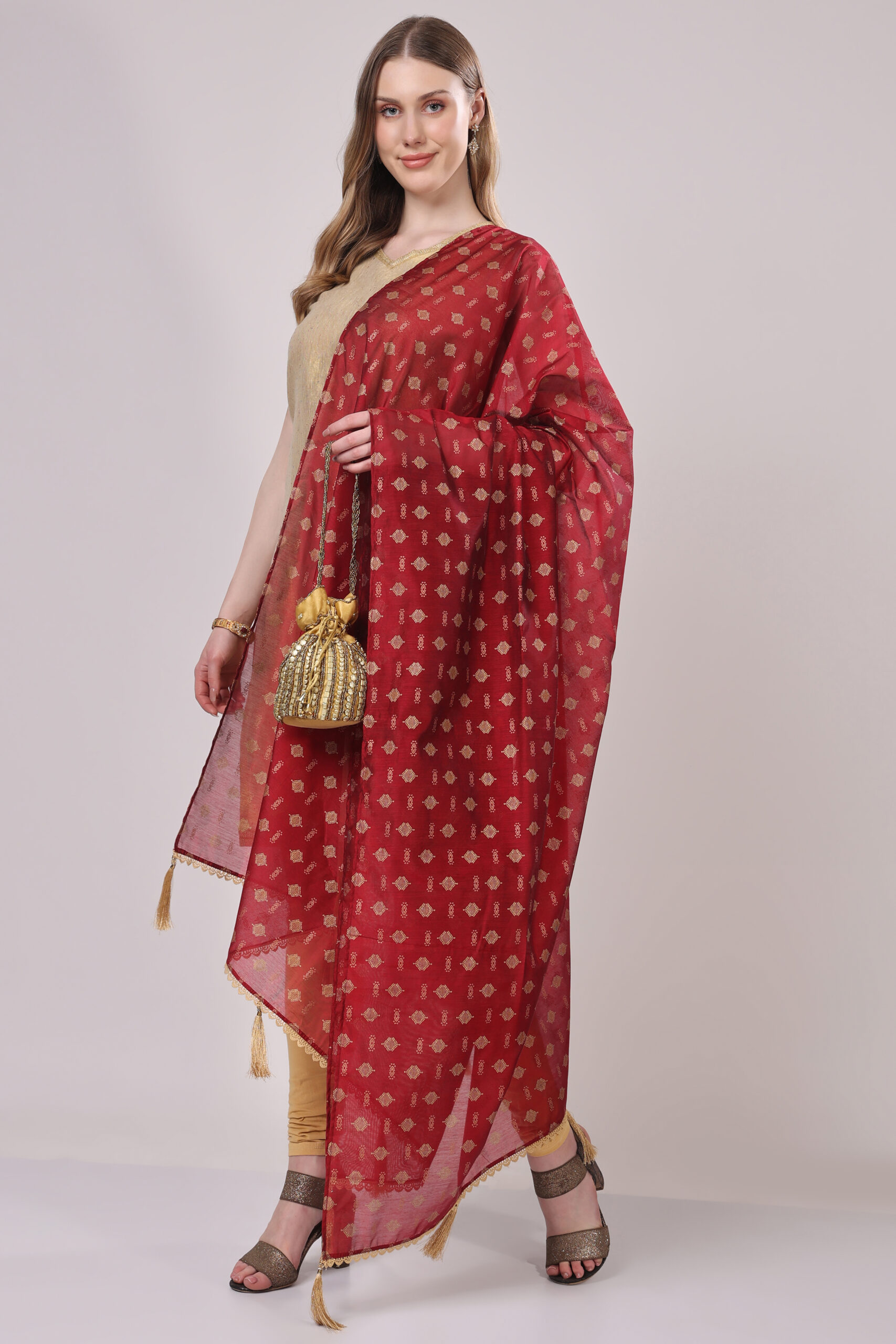 Maroon Chanderi Silk Dupatta with Golden Prints, Lace Detail, and Tassels