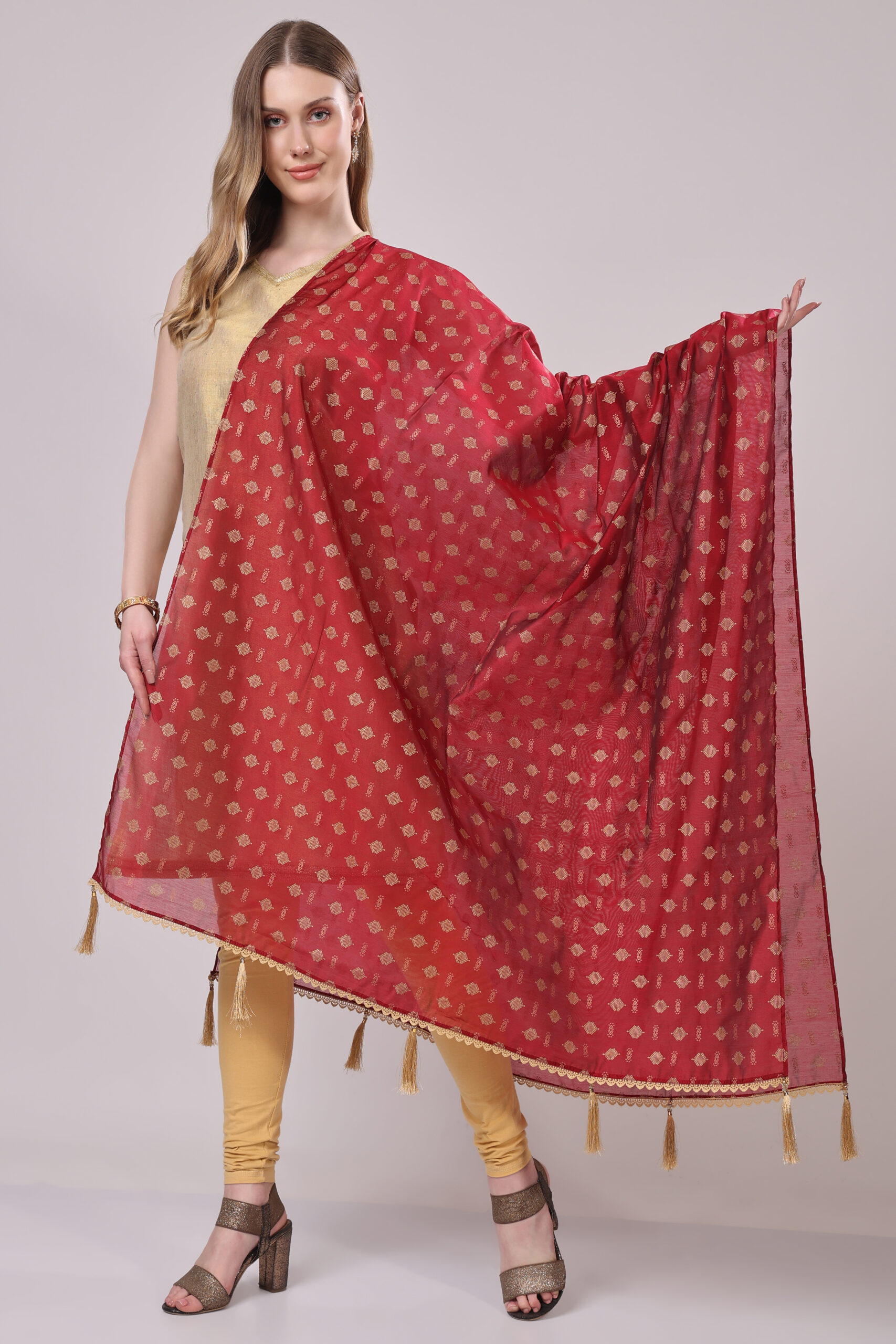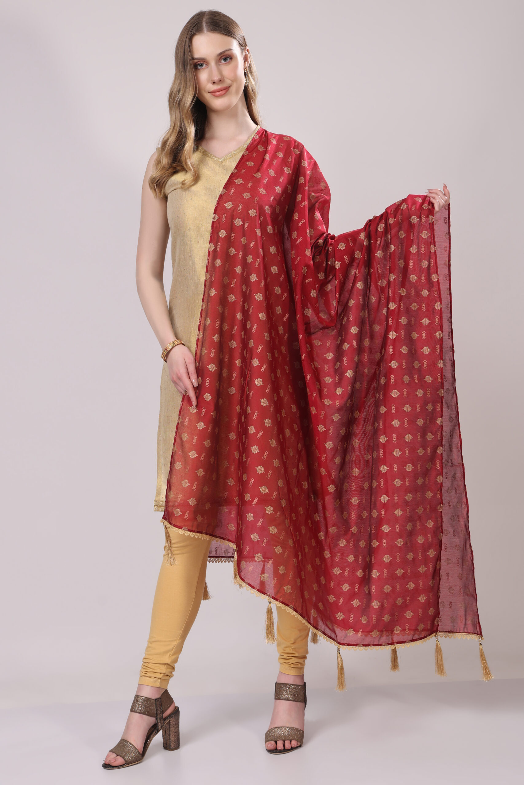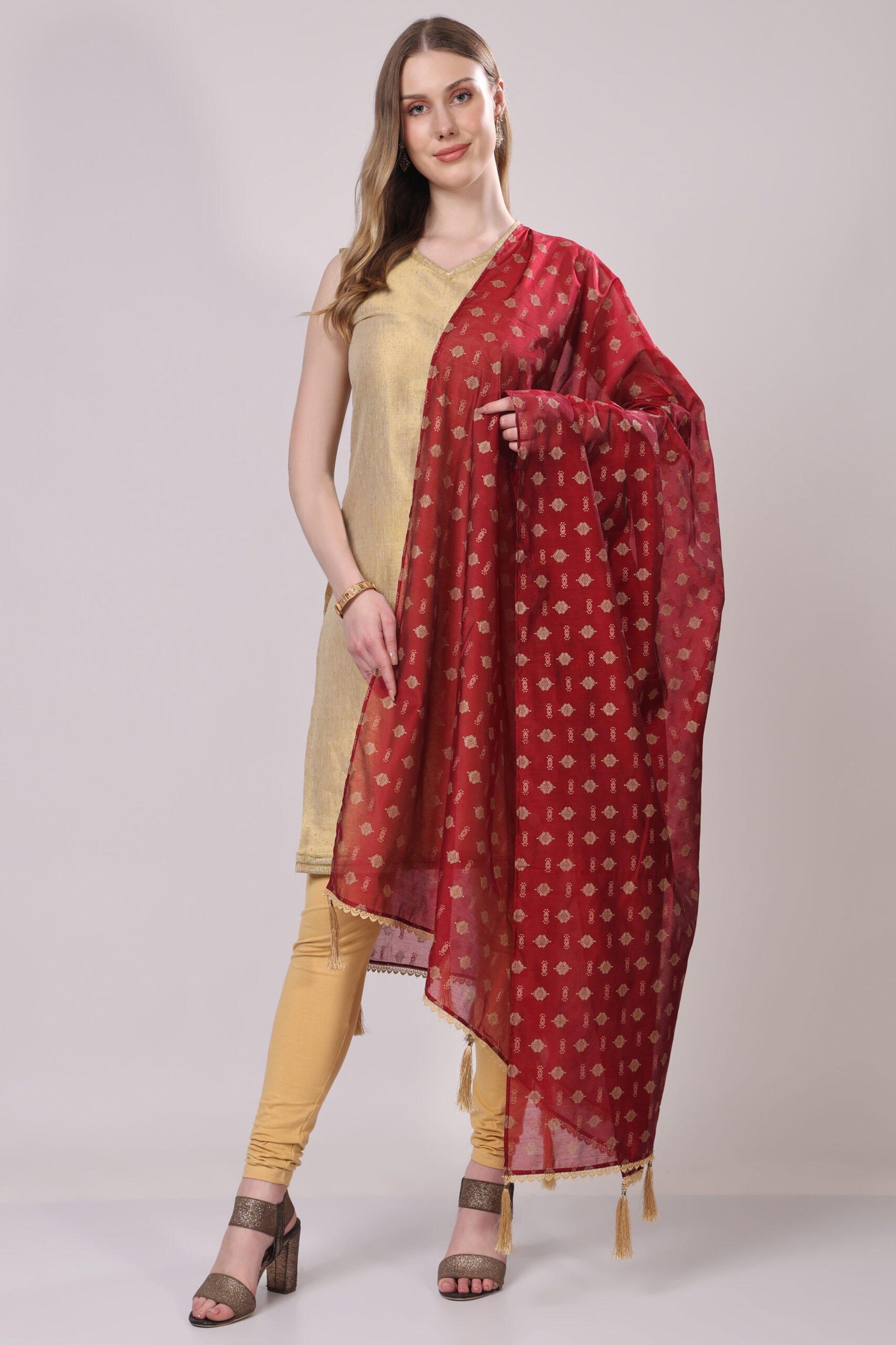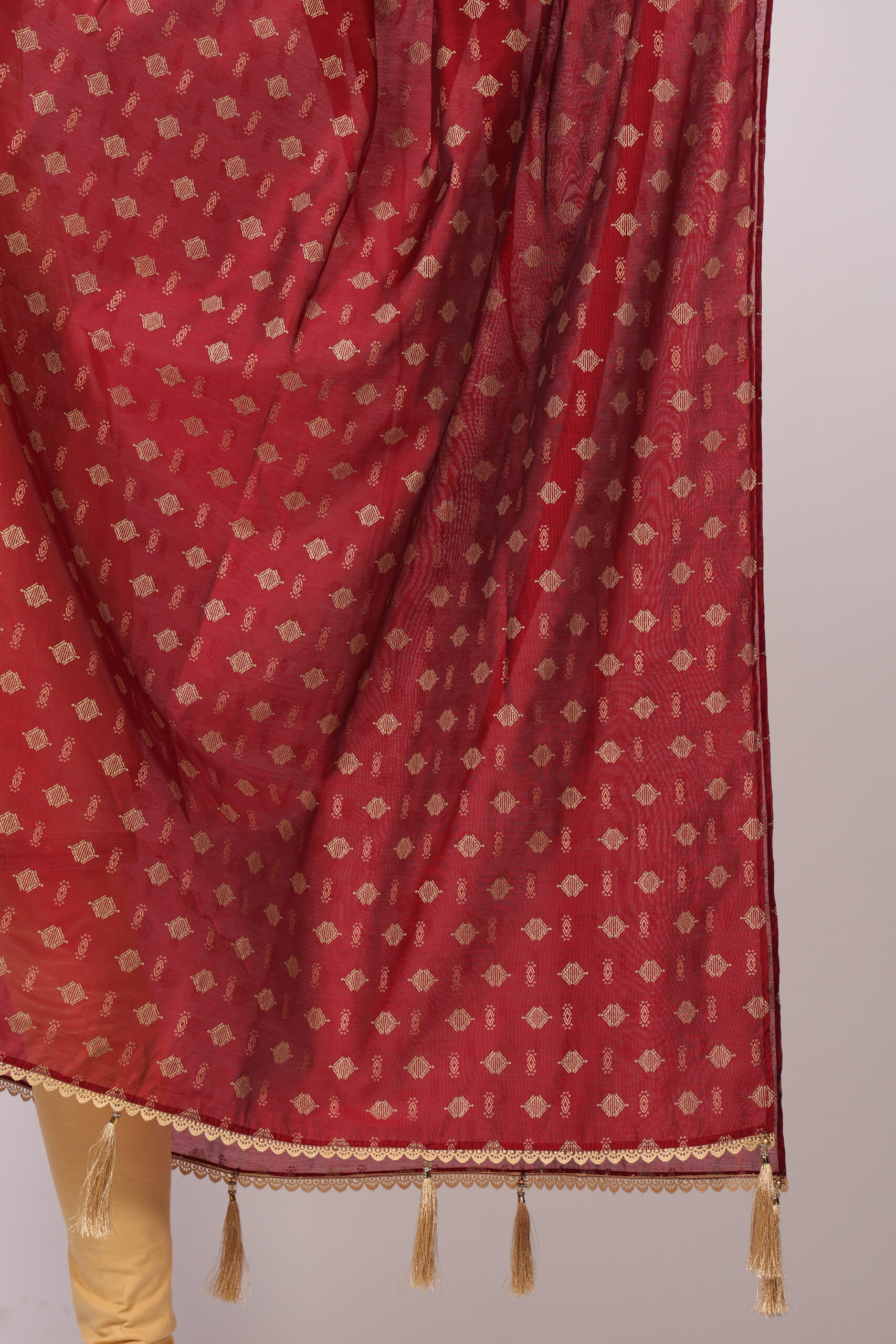 Maroon Chanderi Silk Dupatta with Golden Prints, Lace Detail, and Tassels