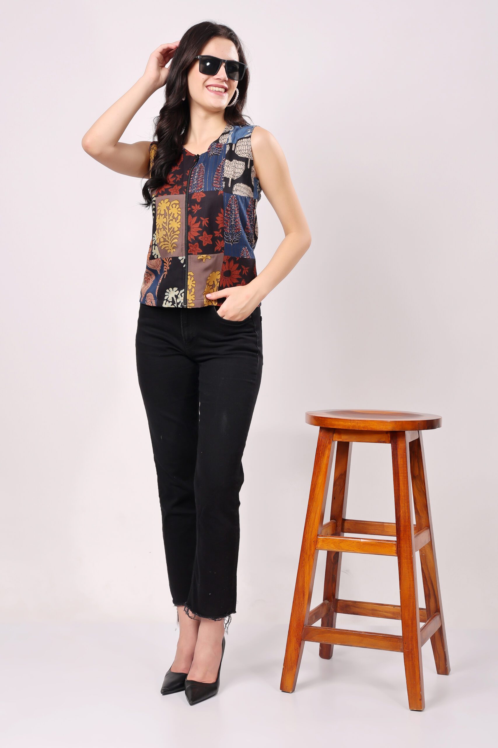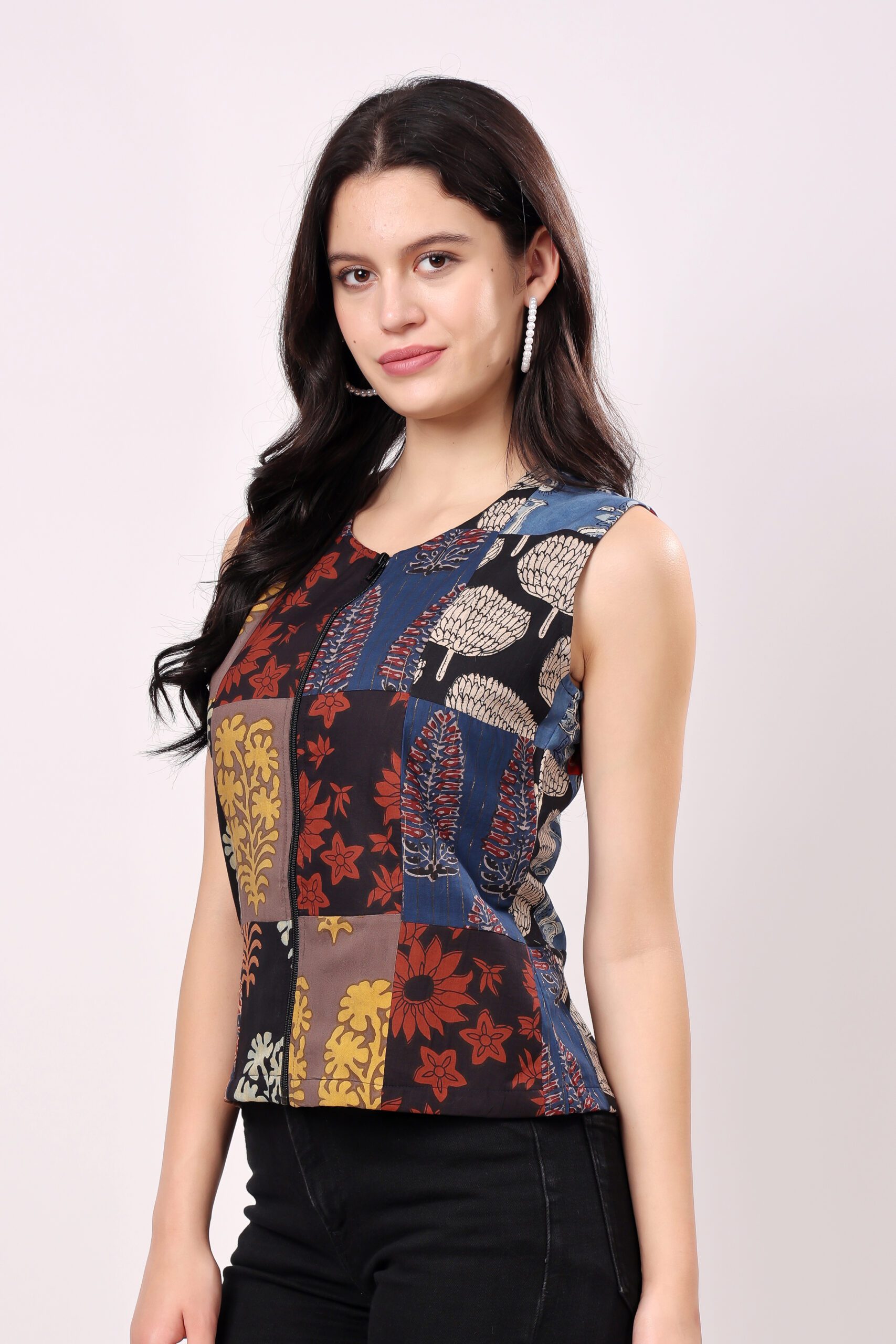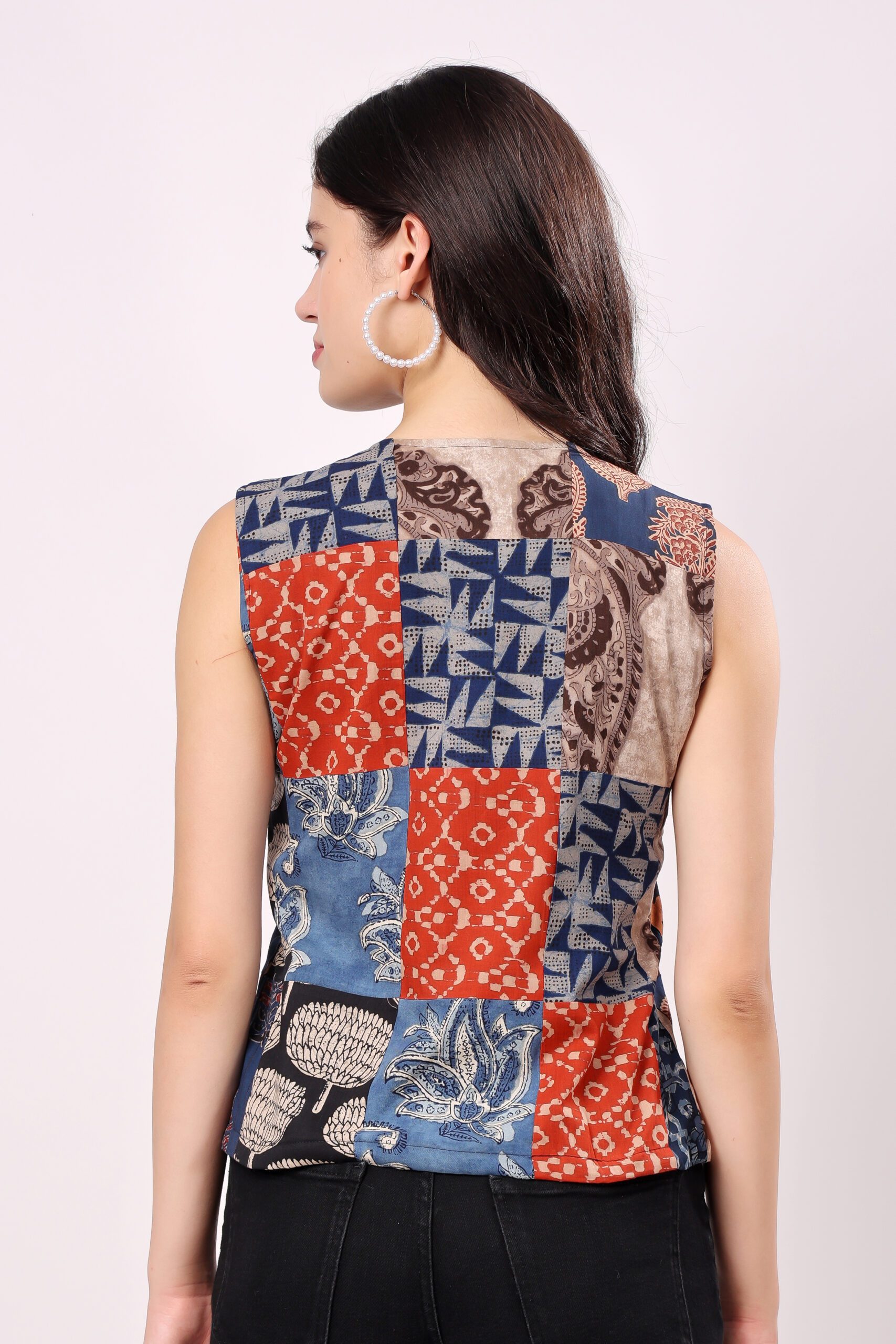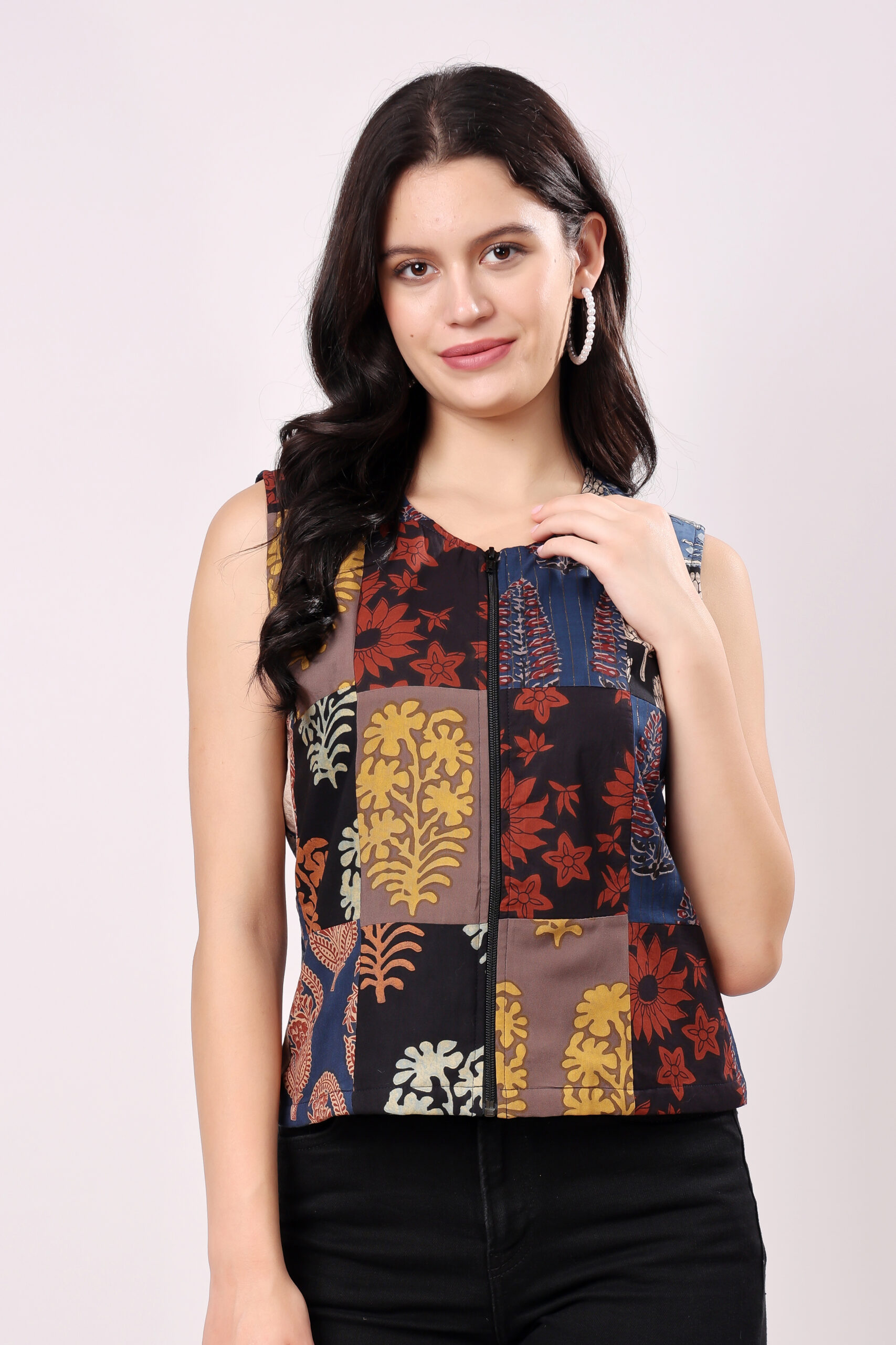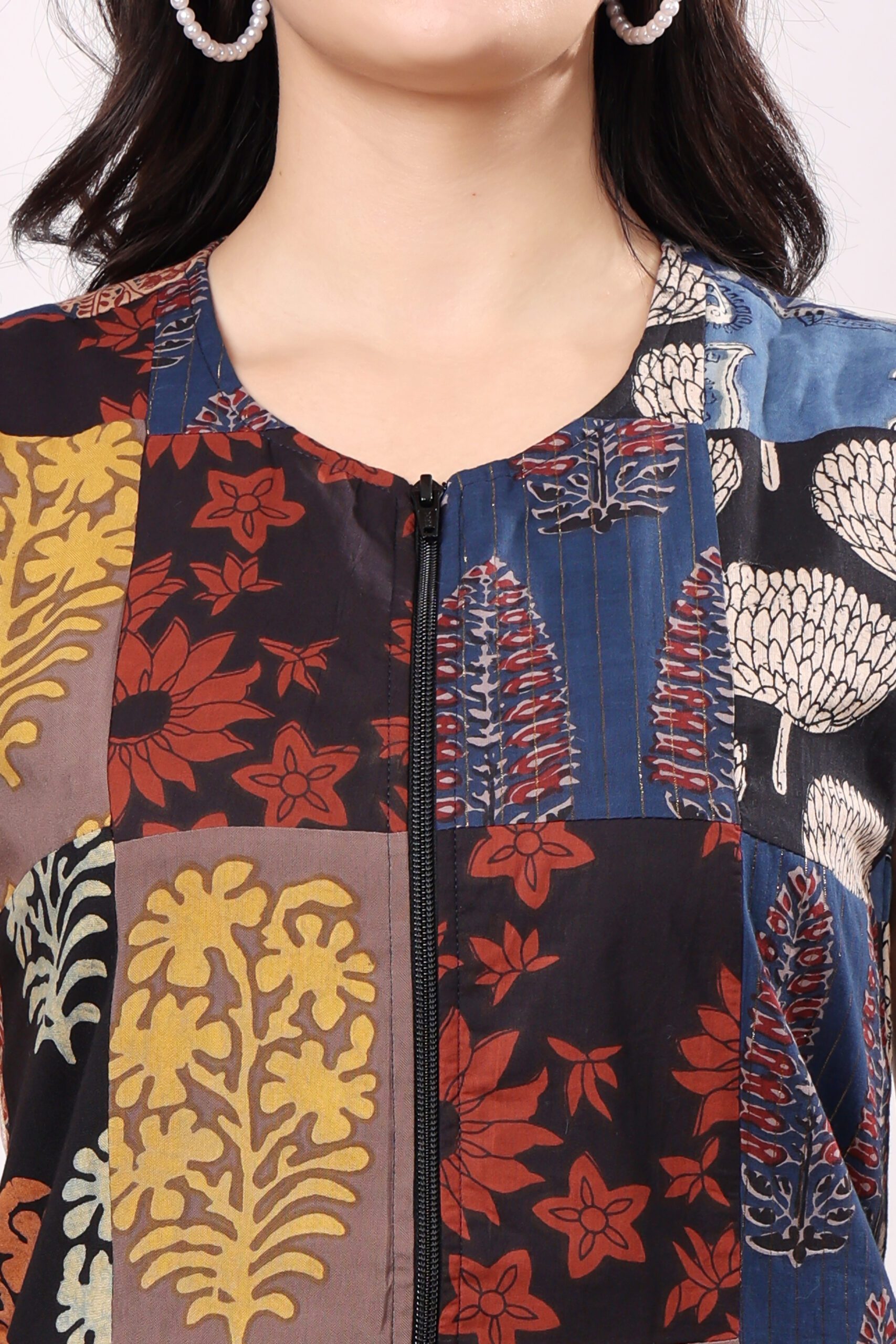 Add a touch of artistry to your wardrobe with this sleeveless block-printed patchwork jacket. Designed for versatile styling, this jacket is crafted from breathable, soft cotton, making it an ideal layering piece year-round. The unique block-printed patchwork pattern adds a vibrant, handcrafted charm that stands out, blending traditional artistry with contemporary appeal.
