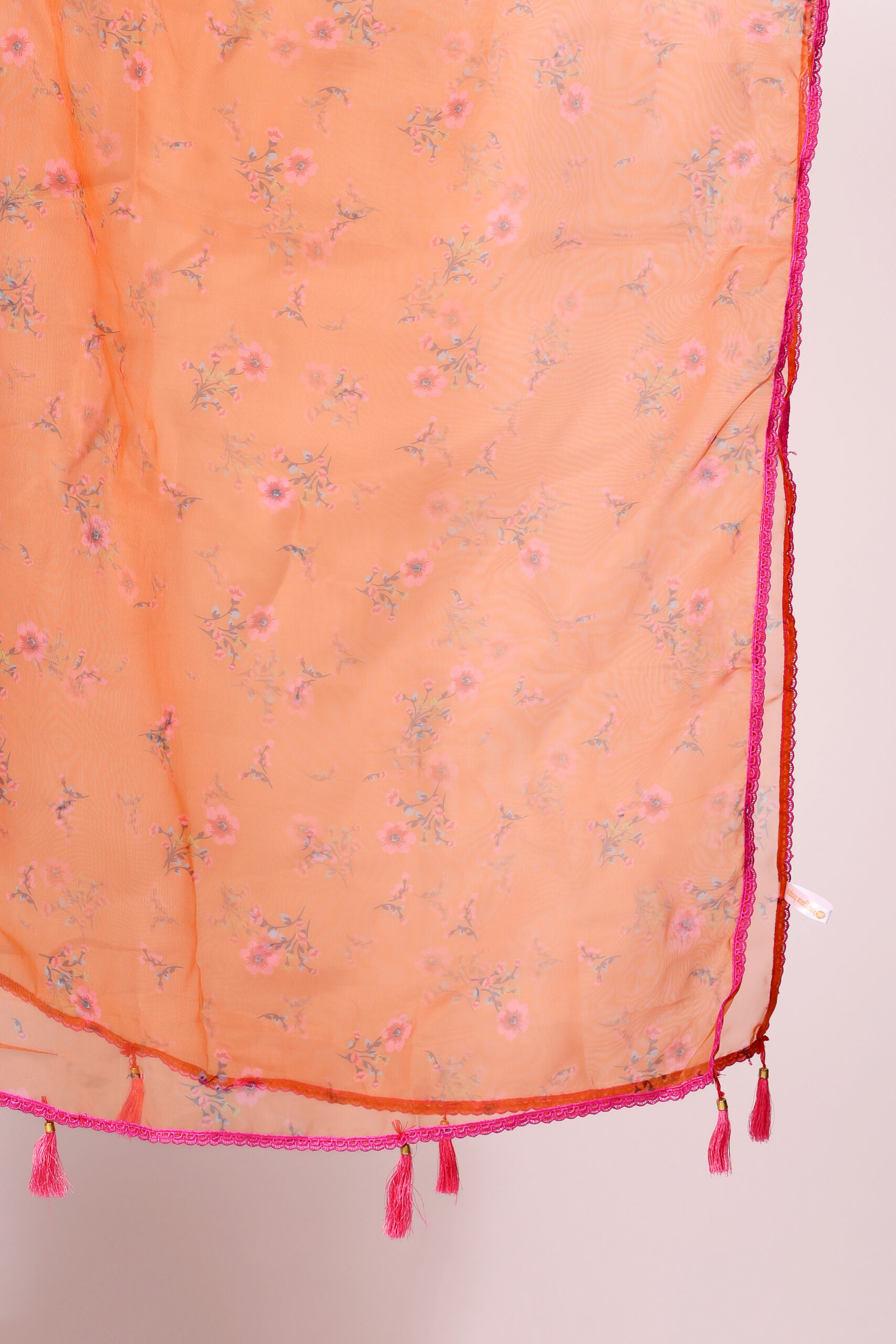 Mustard Yellow Organza Dupatta with Pink Floral Prints, Lace, and Tassels