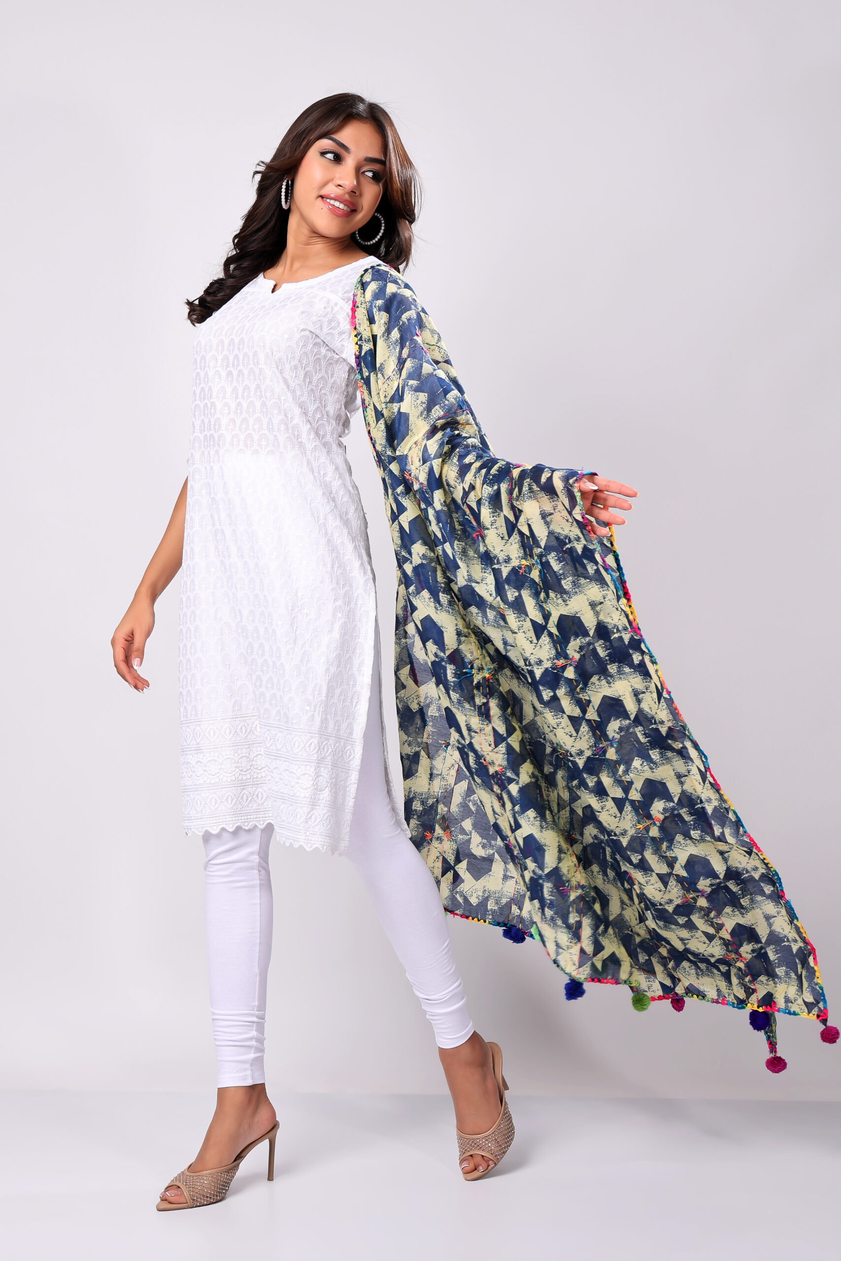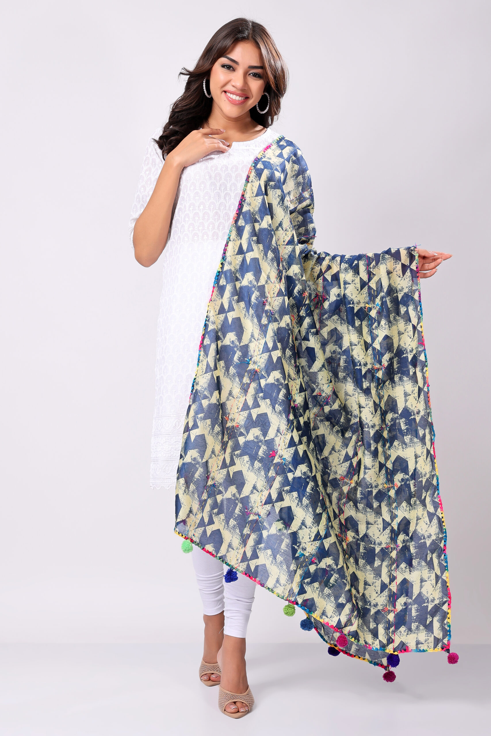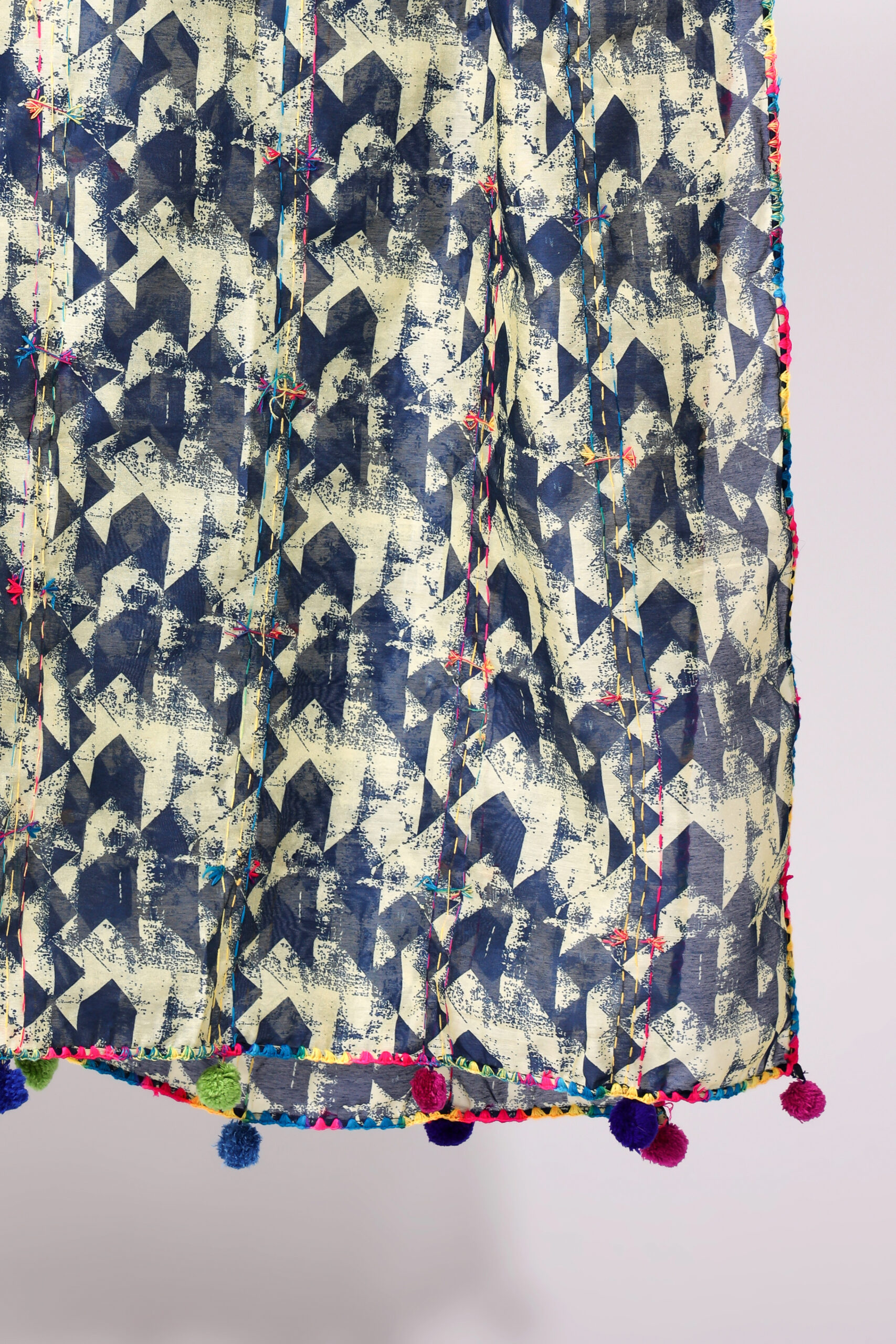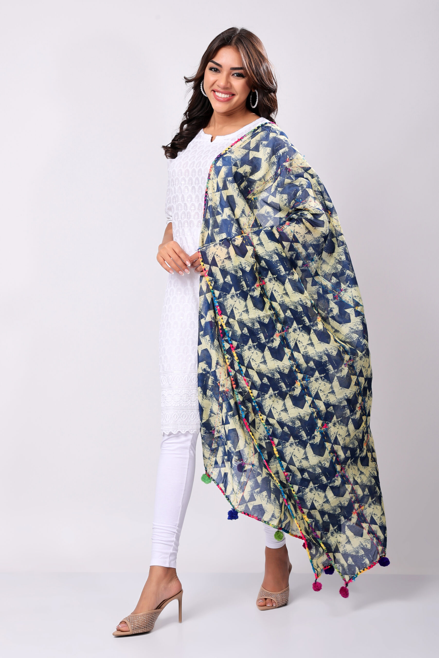 Navy Blue & White Organza Dupatta with Tassels and Lace