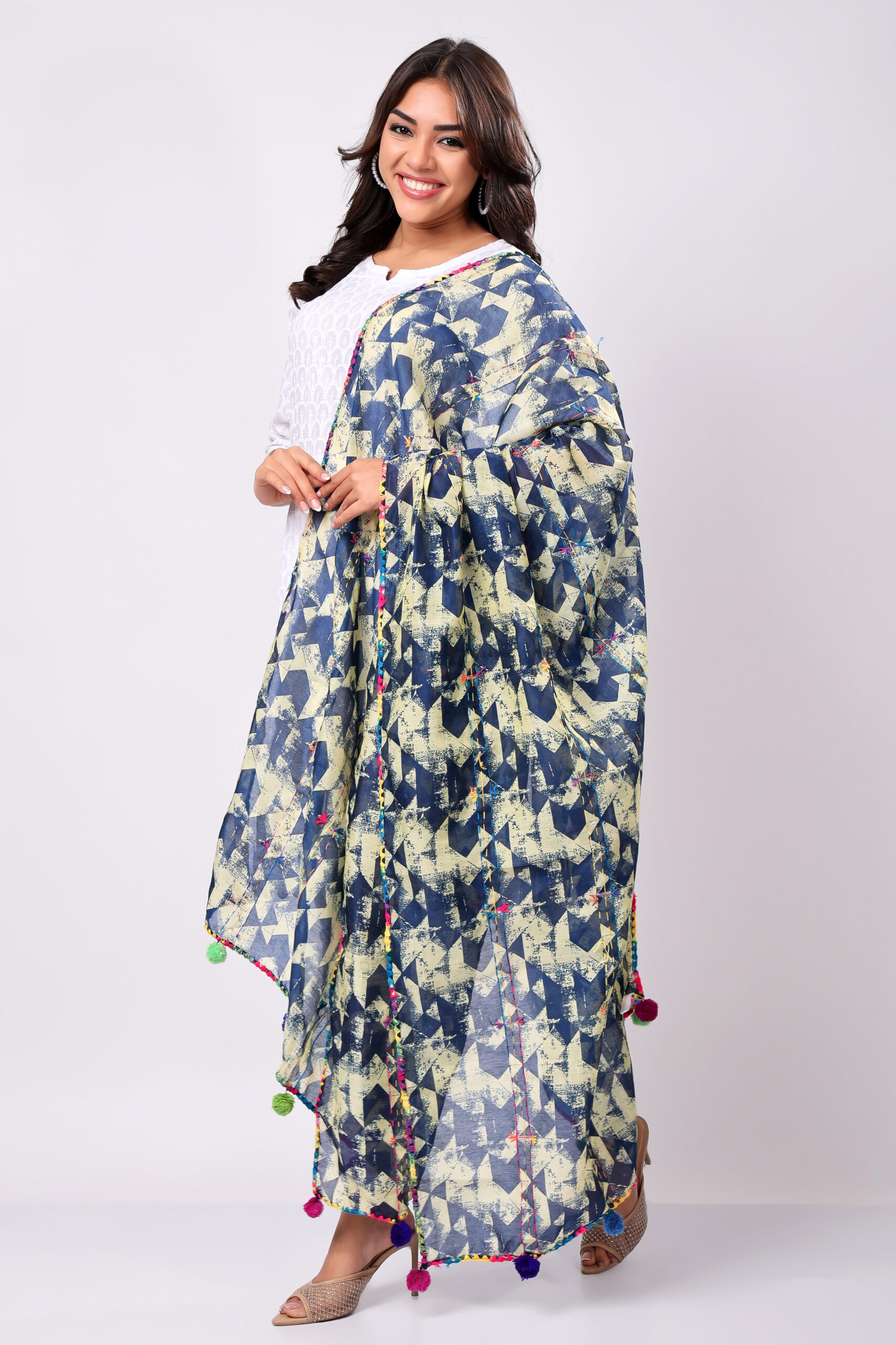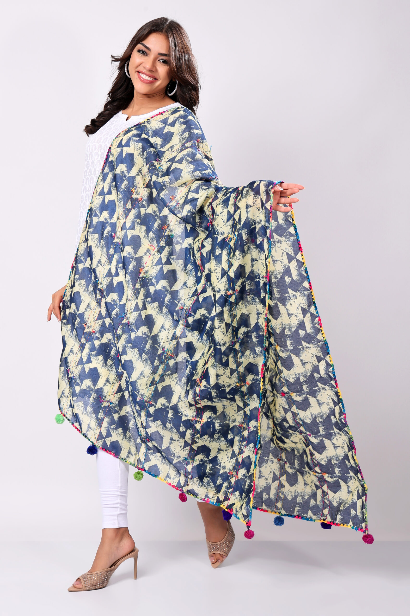 Navy Blue Hand-Embroidered & Printed Chanderi Silk Dupatta with Crochet Borders and Pom-Poms