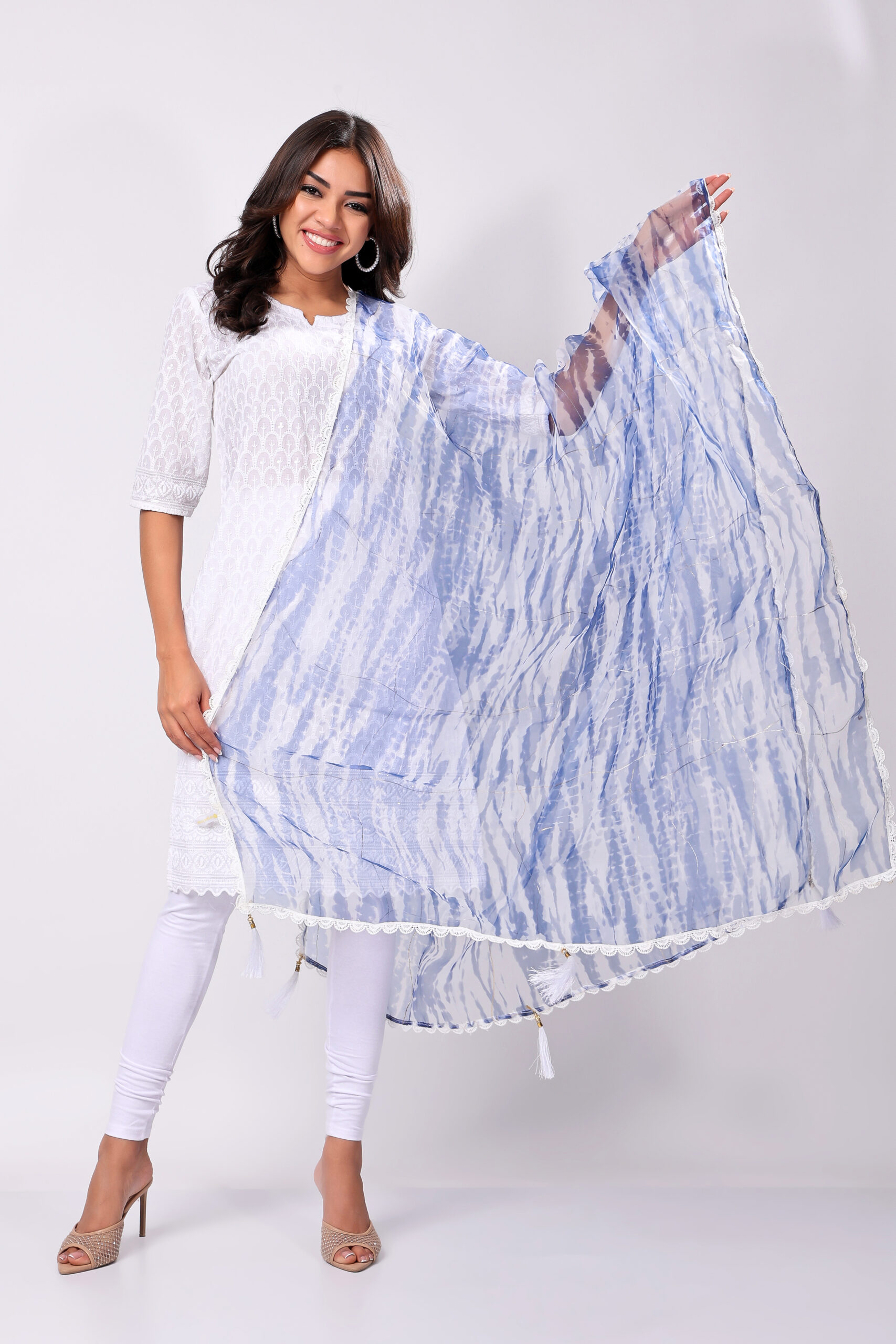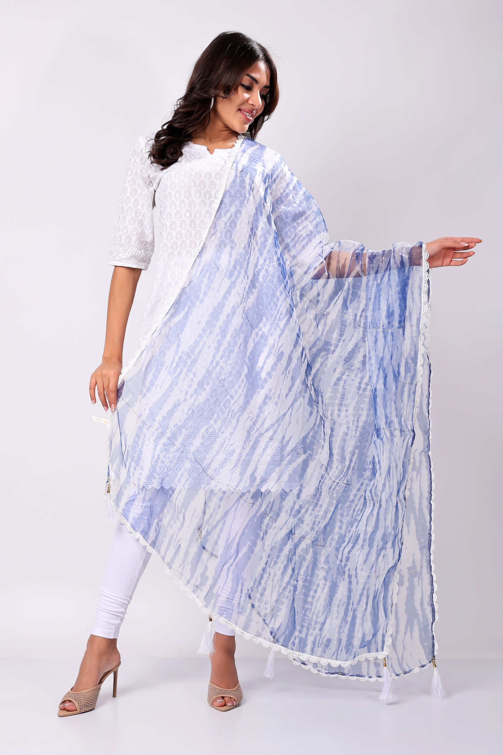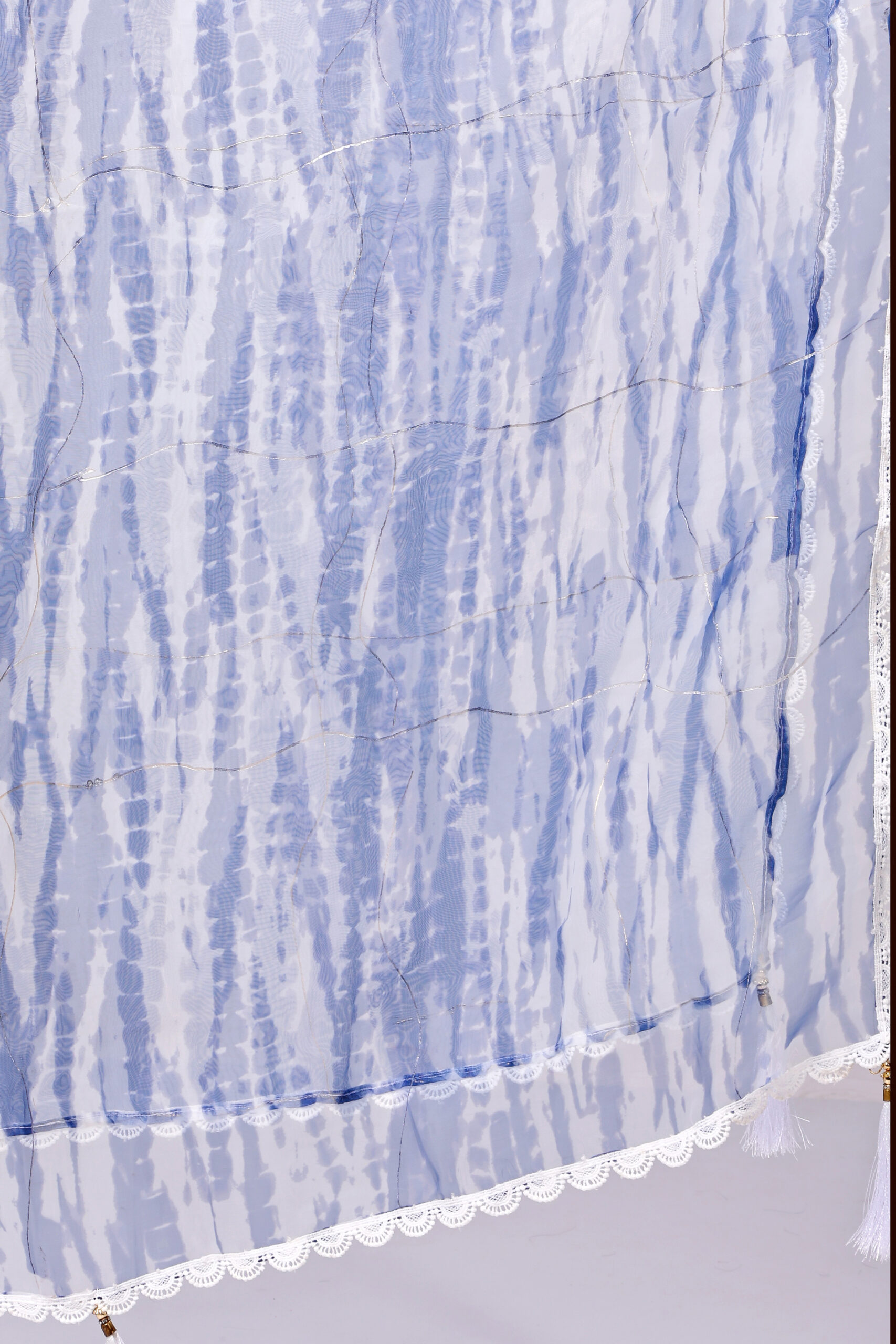 Navy Blue & White Organza Dupatta with Tassels and Lace