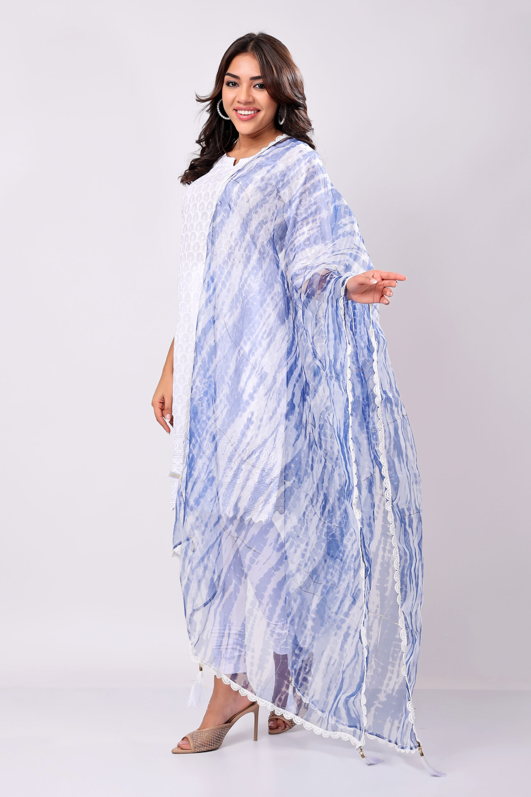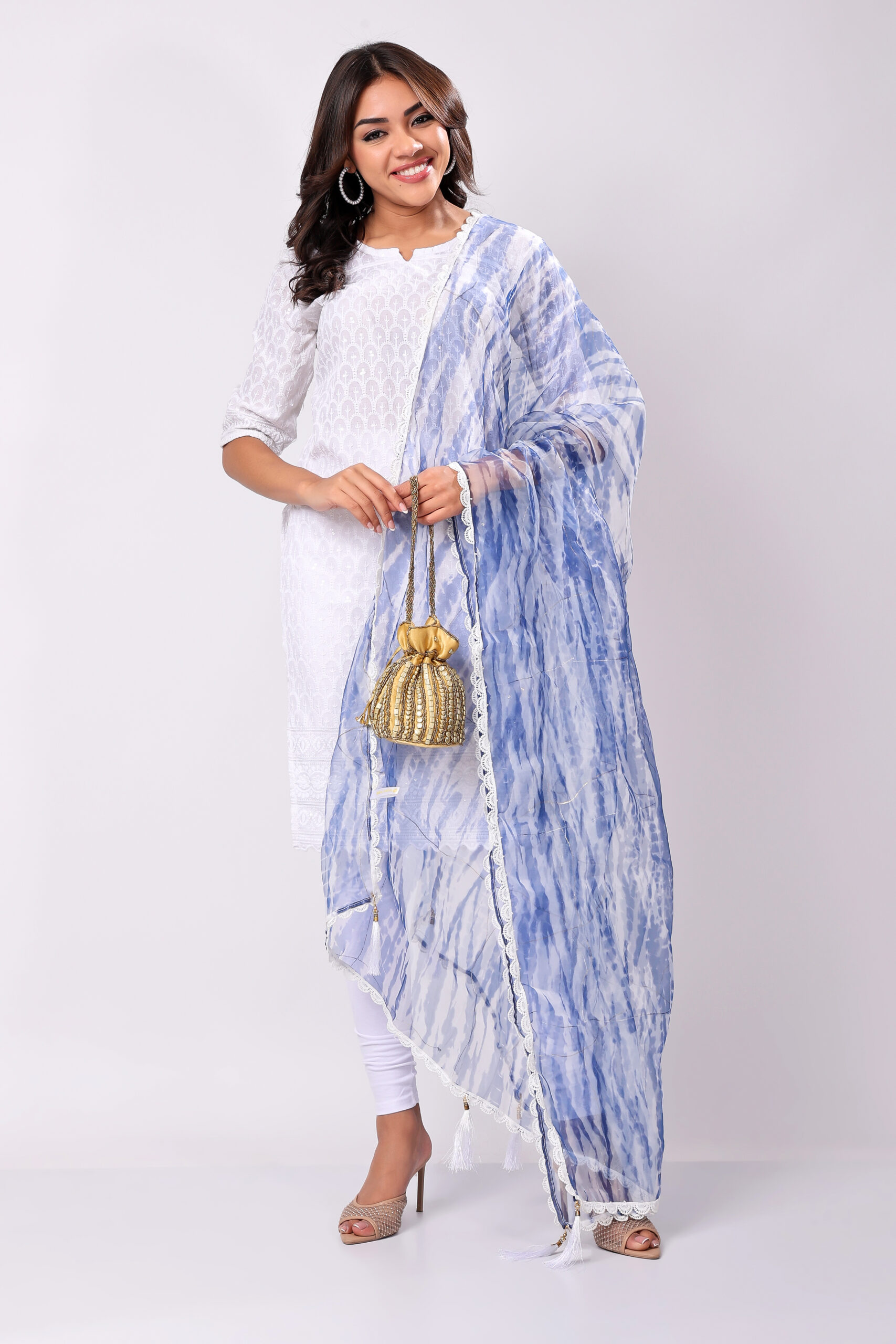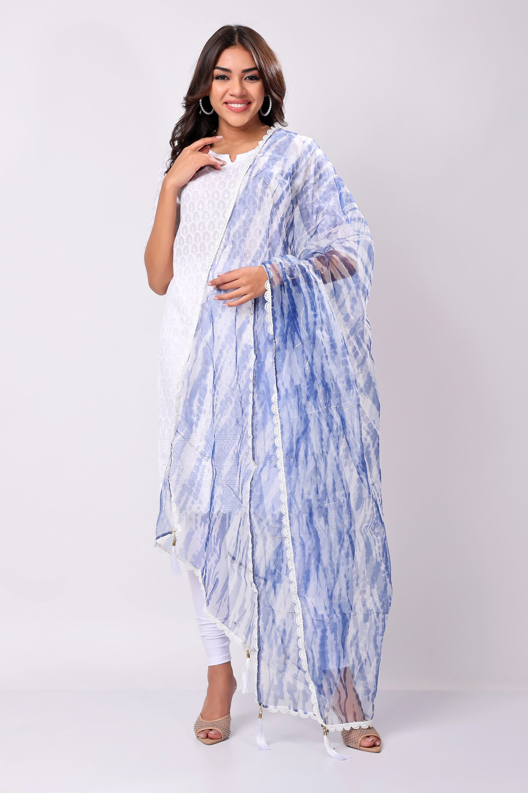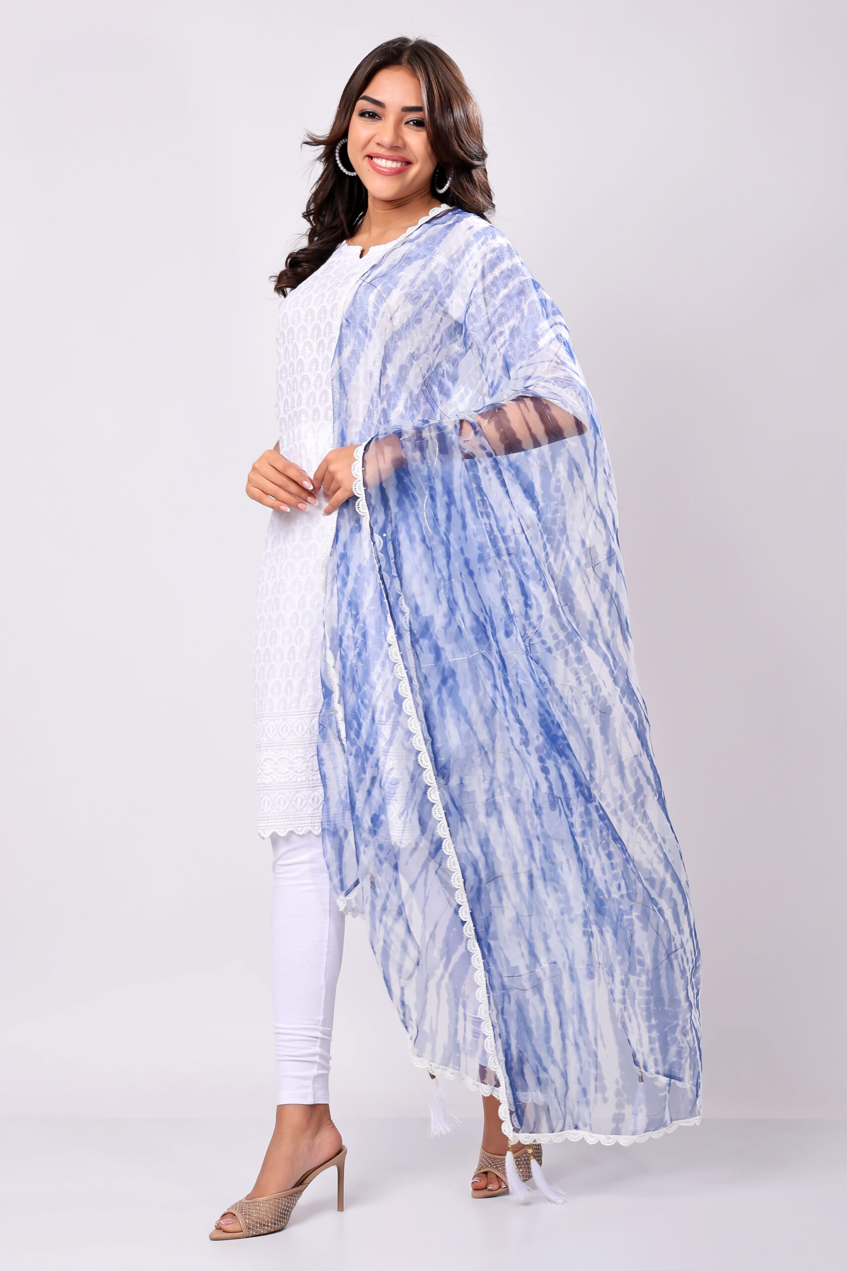 Navy Blue & White Organza Dupatta with Tassels and Lace