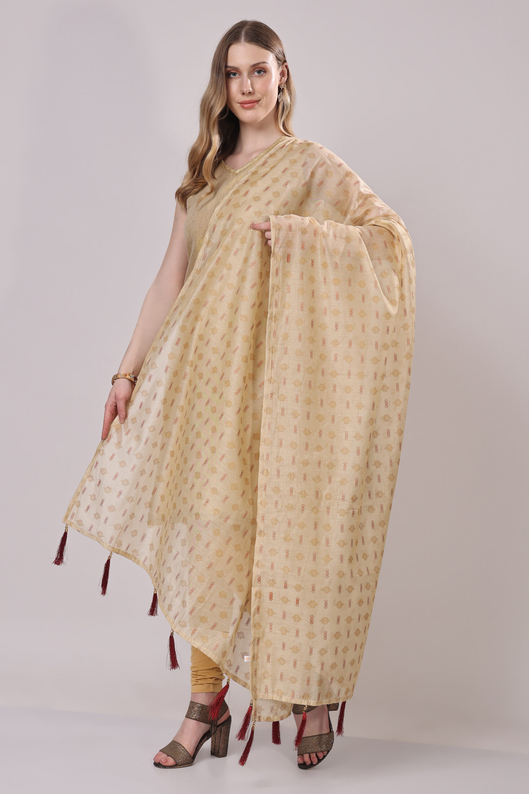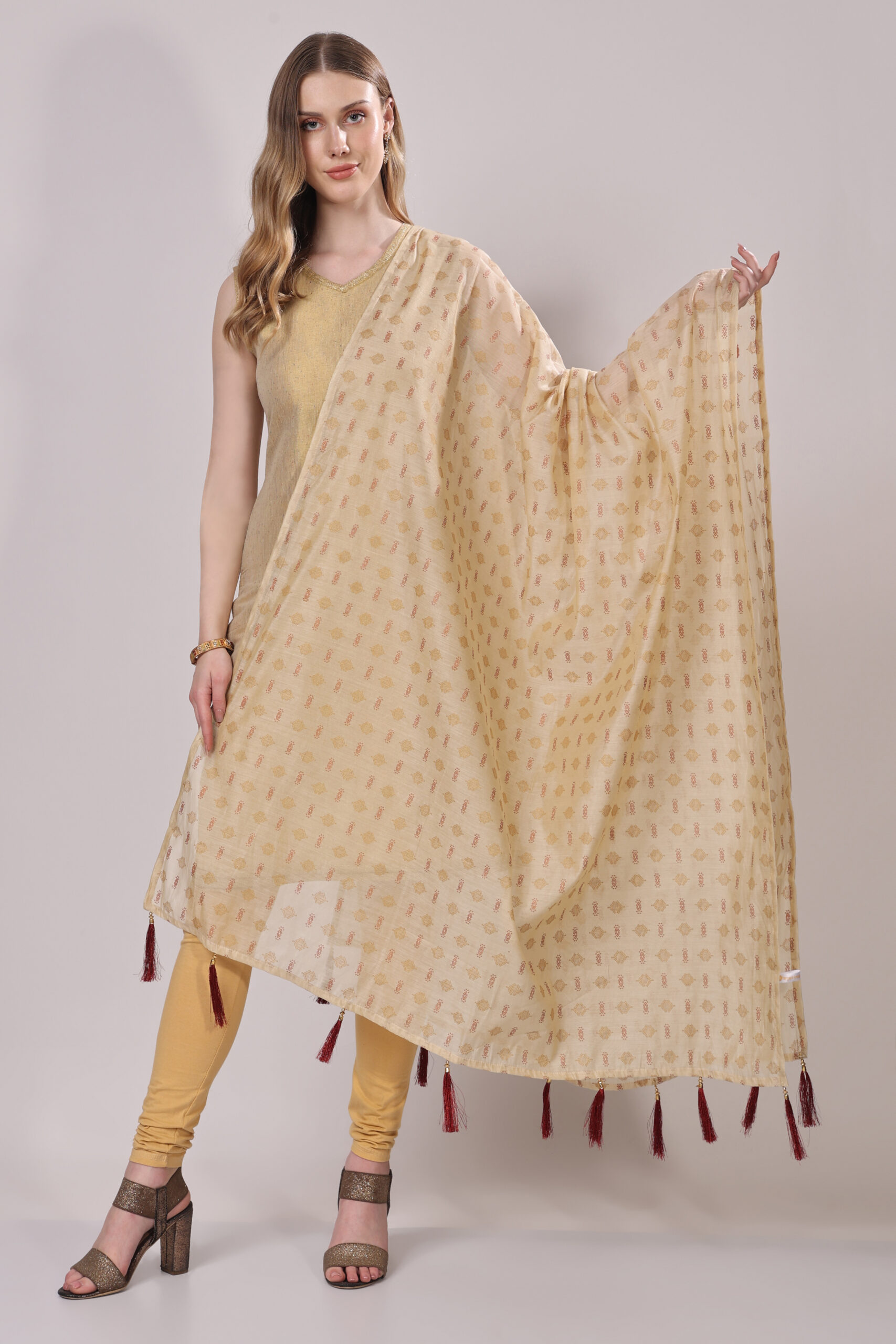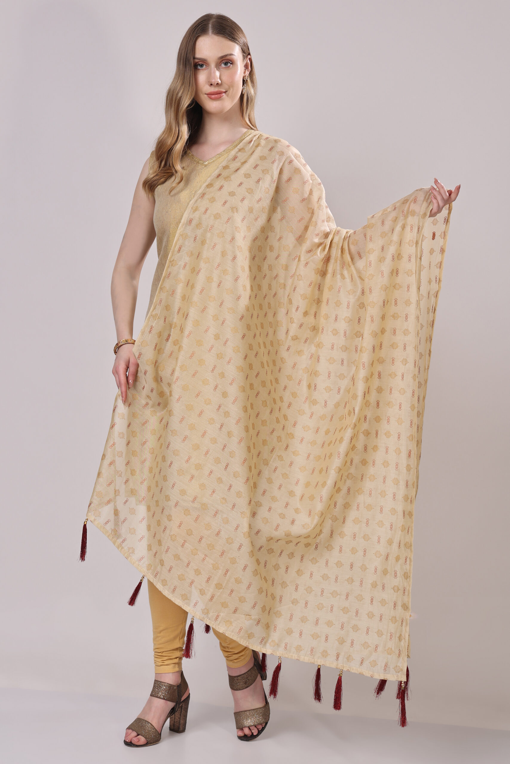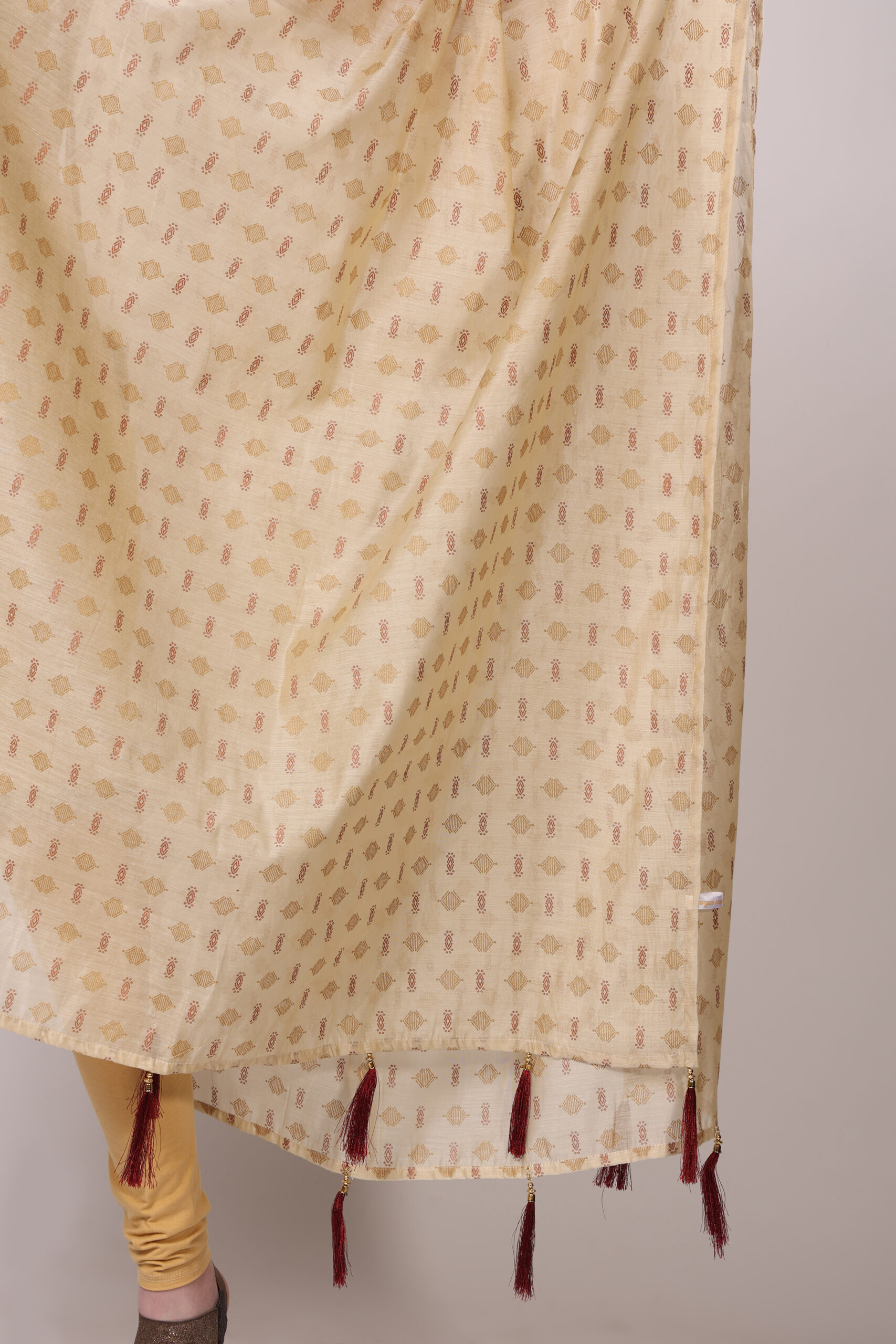 - Design:Intricate golden and maroon prints for a vibrant yet refined look,Coordinated tassels in golden and maroon hues for a stylish finish