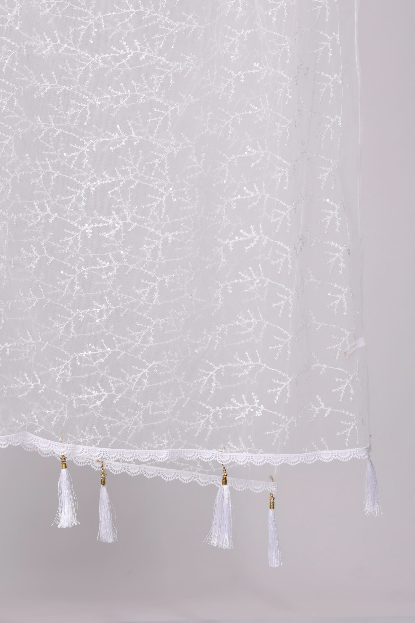 White Net Dupatta with Embroidery, Sequin Work, Lace, and Tassels