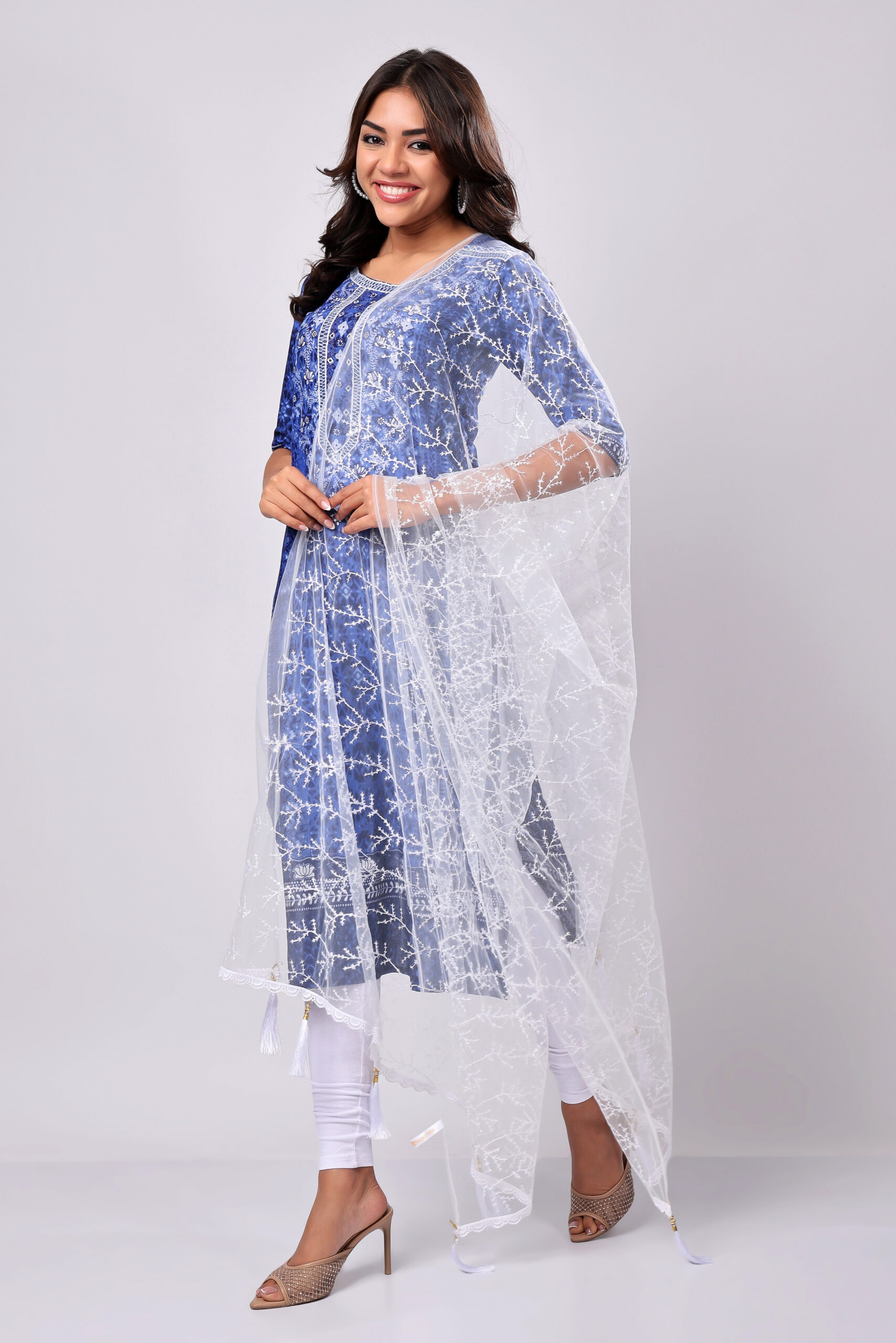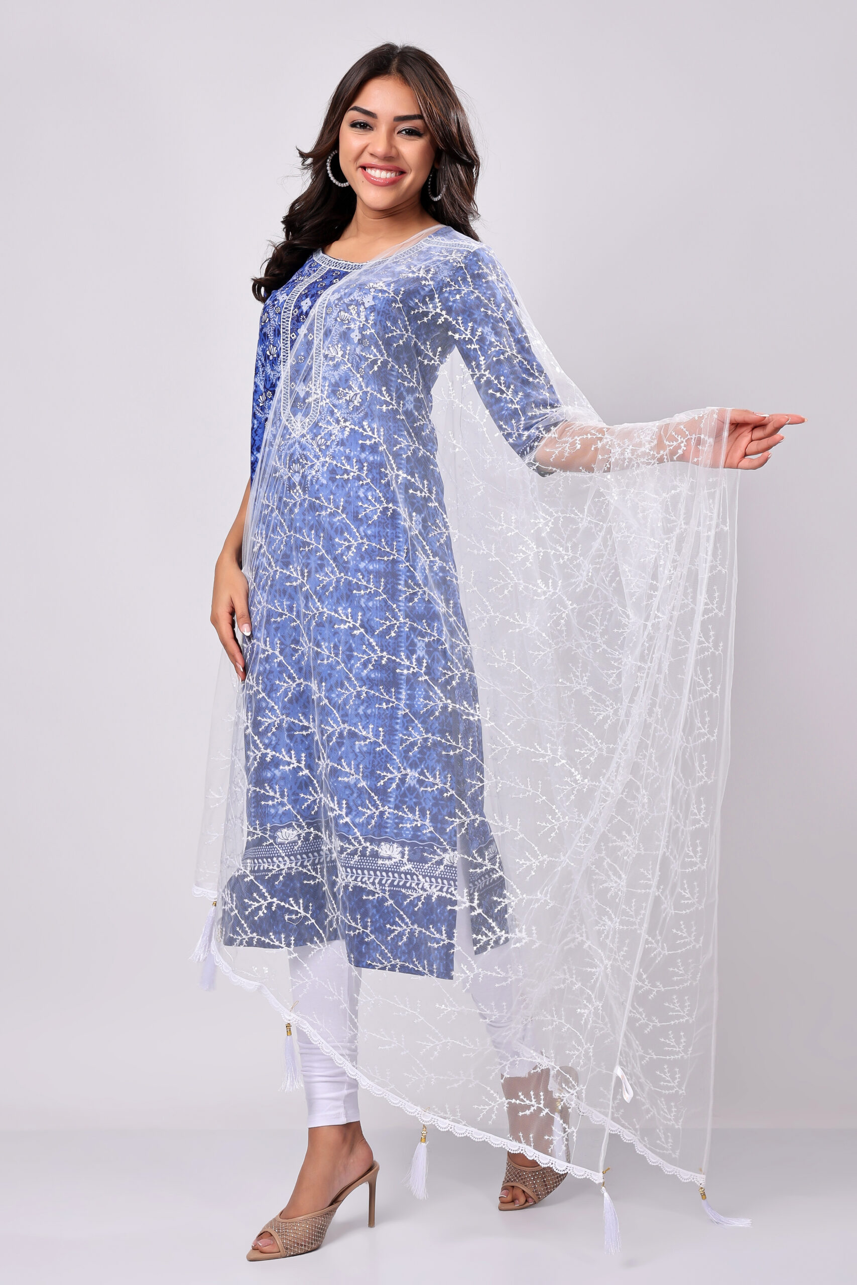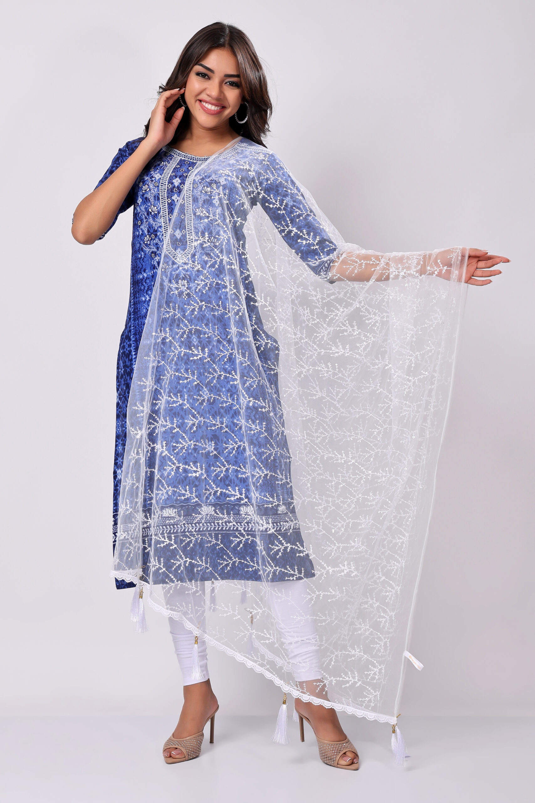 Pair this White Net Dupatta with a navy blue kurta for an ethereal look. Add pearl jewellery and embroidered heels to complete your elegant ensemble.