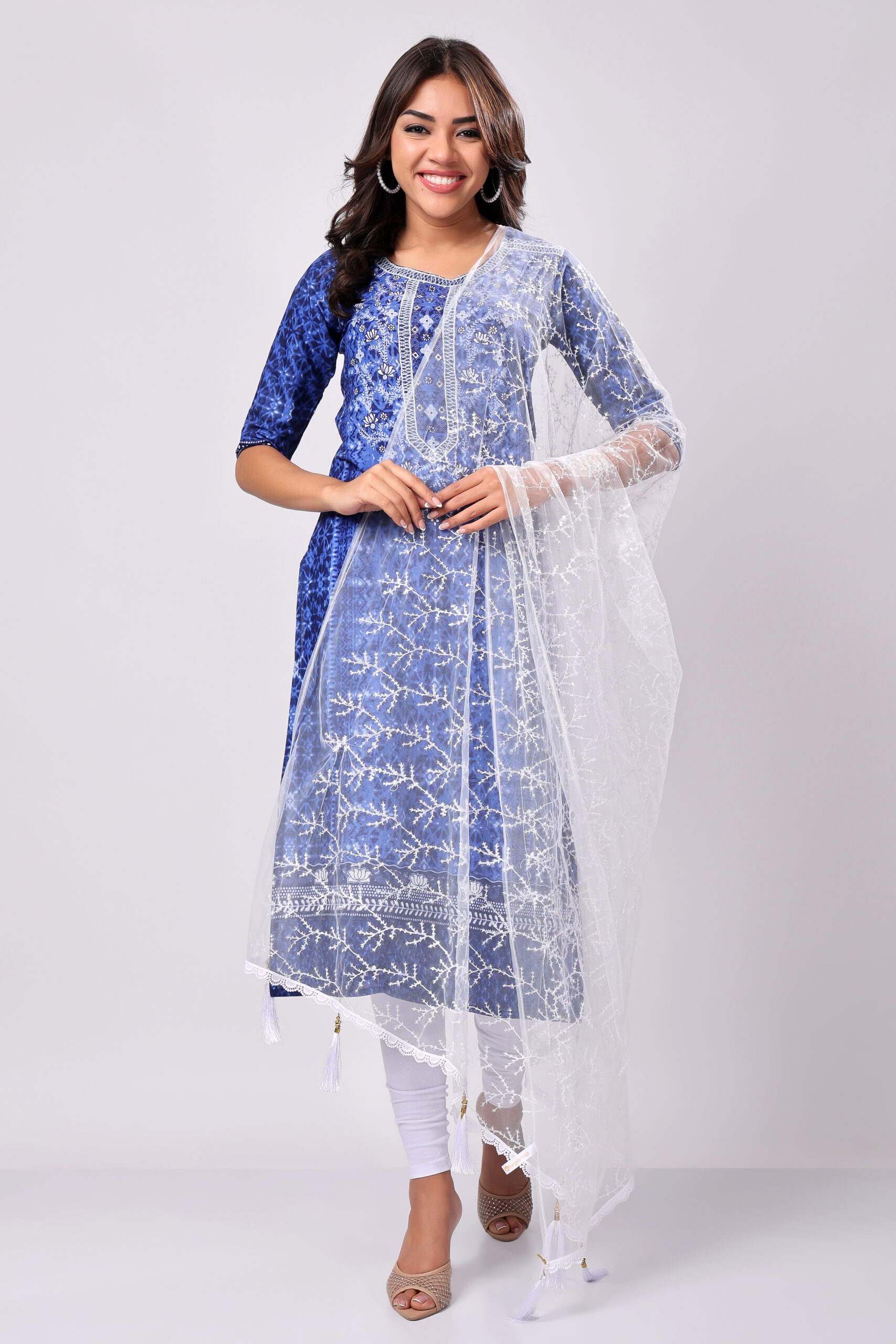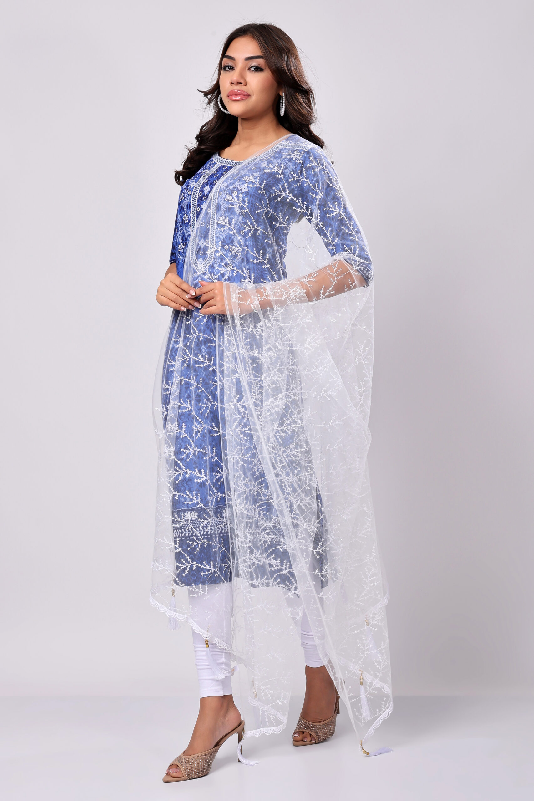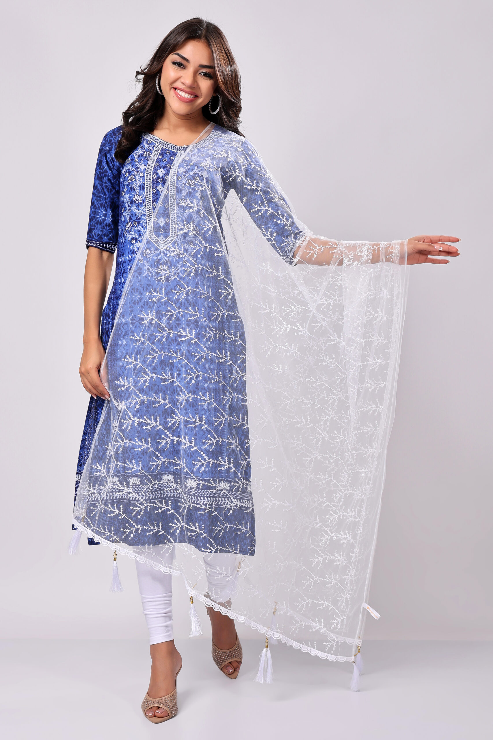 Pair this White Net Dupatta with a navy blue kurta for an ethereal look. Add pearl jewellery and embroidered heels to complete your elegant ensemble.