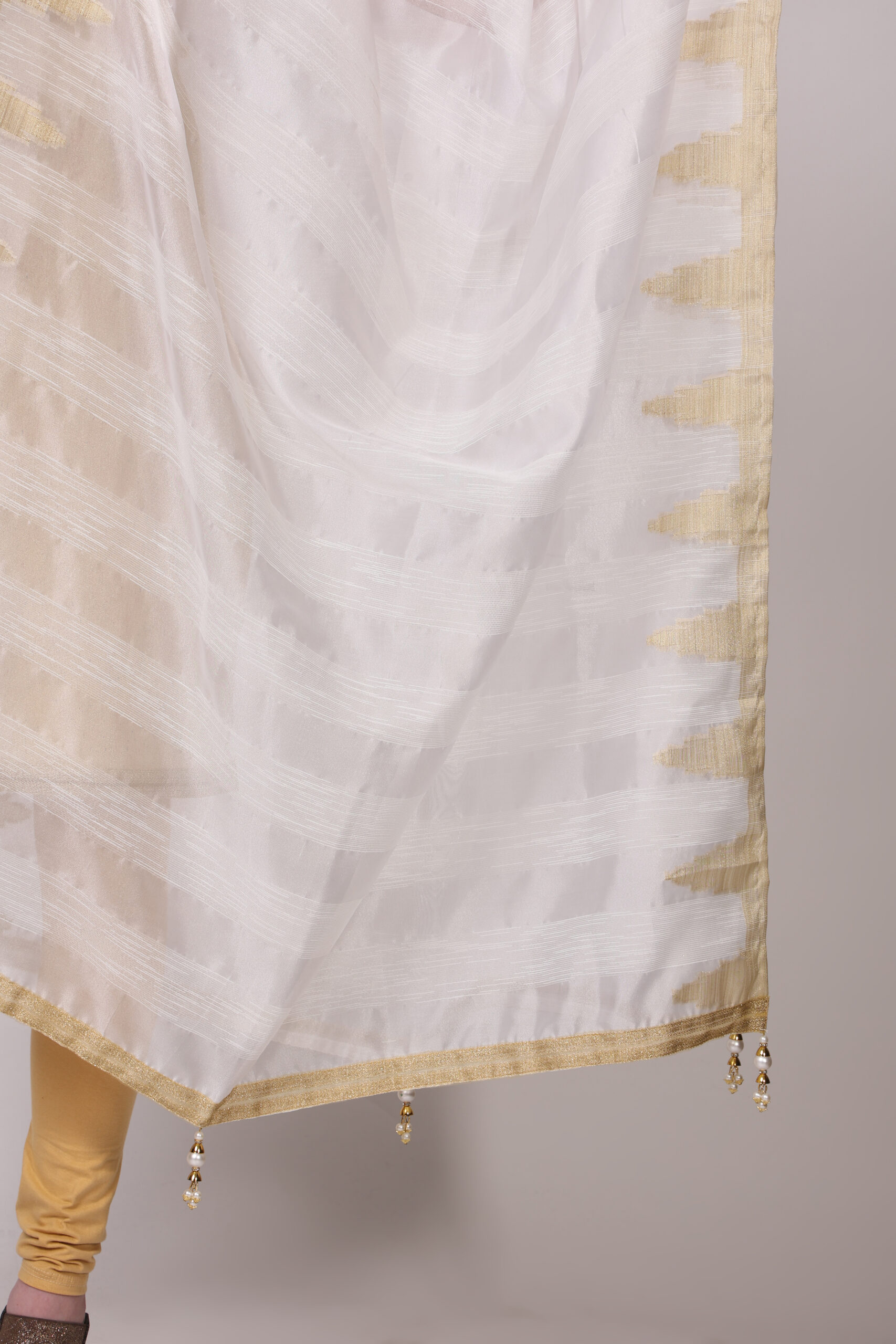 White Viscose Silk Dupatta with Lace Details and Golden Tassels