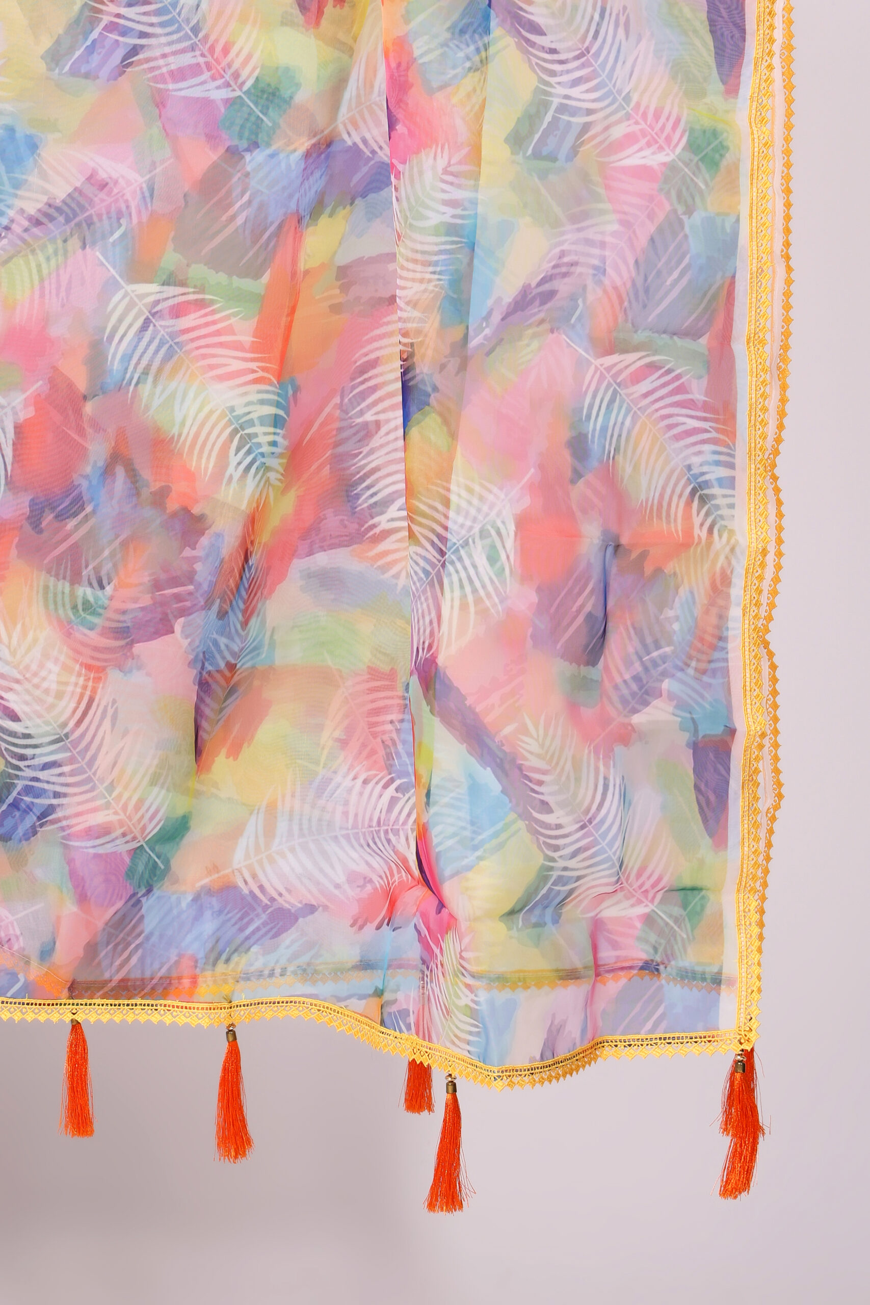 - Design: Having leaf patterns elegantly printed throughout, enhanced with delicate lace detailing and stylish tassels at the bottom for a graceful finish